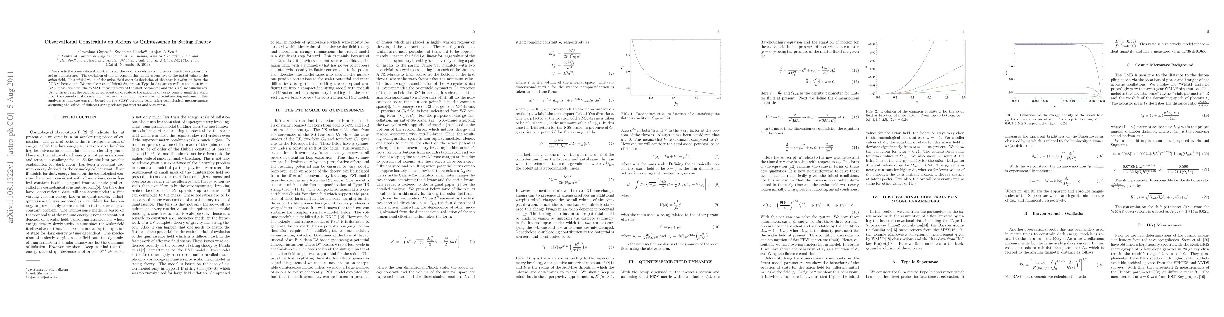 Researchers study axion models in string theory that could act as quintessence, finding tiny deviations from cosmological constant behavior even at 2 °2 confidence level. The analysis also sets bounds on supersymmetry breaking scale using cosmological measurements.