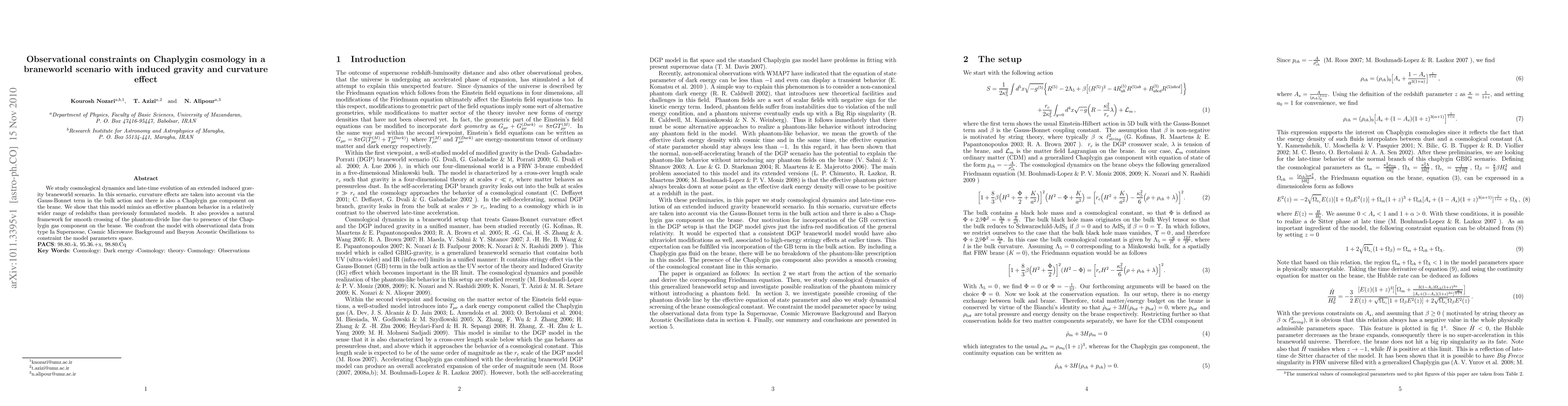 We study cosmological dynamics and late-time evolution of an extended induced gravity braneworld scenario. In this scenario, curvature effects are taken into account via the Gauss-Bonnet term in the bulk action and there is also a Chaplygin gas component on the brane. We show that this model mimics an effective phantom behavior in a relatively wider range of redshifts than previously formulated models. It also provides a natural framework for smooth crossing of the phantom-divide line due to presence of the Chaplygin gas component on the brane. We confront the model with observational data from type Ia Supernovae, Cosmic Microwave Background and Baryon Acoustic Oscillations to constraint the model parameters space.
