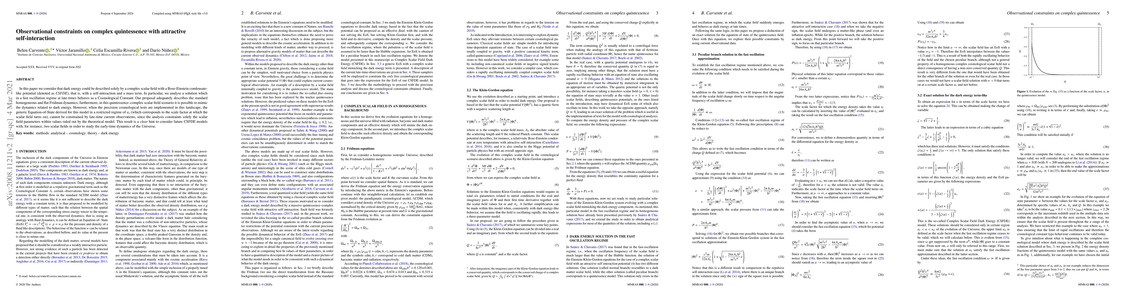 In this paper we consider that dark energy could be described solely by a complex scalar field with a Bose-Einstein condensate-like potential (denoted as CSFDE), that is, with a self-interaction and a mass term. In particular, we analyse a solution which in a fast oscillation regime at late-times behaves as a Cosmological Constant. Our proposal adequately describes the standard homogeneous and flat Fridman dynamics, furthermore, in this quintessence--complex scalar field scenario it is possible to mimic the dynamics related to dark energy. However, when the precision cosmological tests are implemented in this landscape, the generic Equation-of-State derived for this model in a restricted regime of a_i (which corresponds to the scale factor at which the scalar field turns on), cannot be constrained by late-time current observations, since the analysis constraints solely the scalar field parameters within values ruled out by the theoretical model. This result is a clear hint to consider future CSFDE models with, for instance, two scalar fields in order to study the early-time dynamics of the Universe.