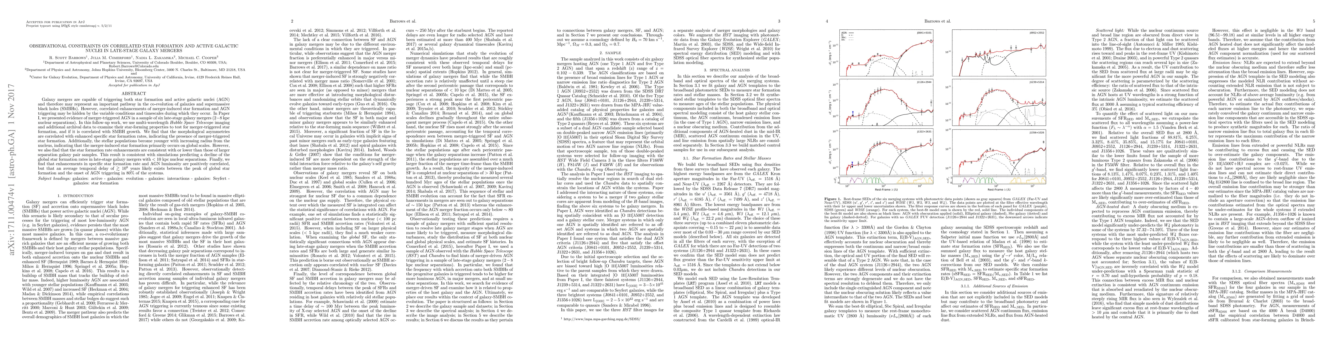 This paper investigates star formation and active galactic nuclei (AGN) in late-stage galaxy mergers, finding that morphological asymmetries correlate with enhanced specific star formation rates, suggesting merger-triggered star formation. It also reveals a temporal delay of over 10^8 years between peak star formation and AGN onset, indicating a complex interplay between these processes.