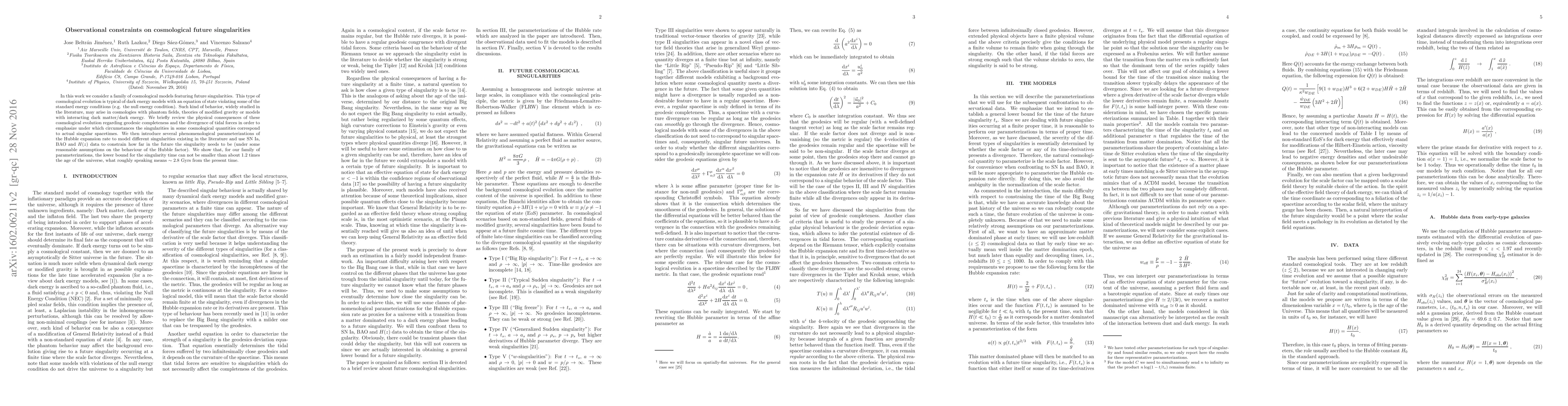 This paper examines cosmological models with future singularities, typically arising from dark energy violating standard energy conditions, and uses observational data to constrain the timing of these singularities. The study finds that the earliest possible singularity occurs approximately 2.8 billion years from now, based on Hubble expansion rate parameterizations.