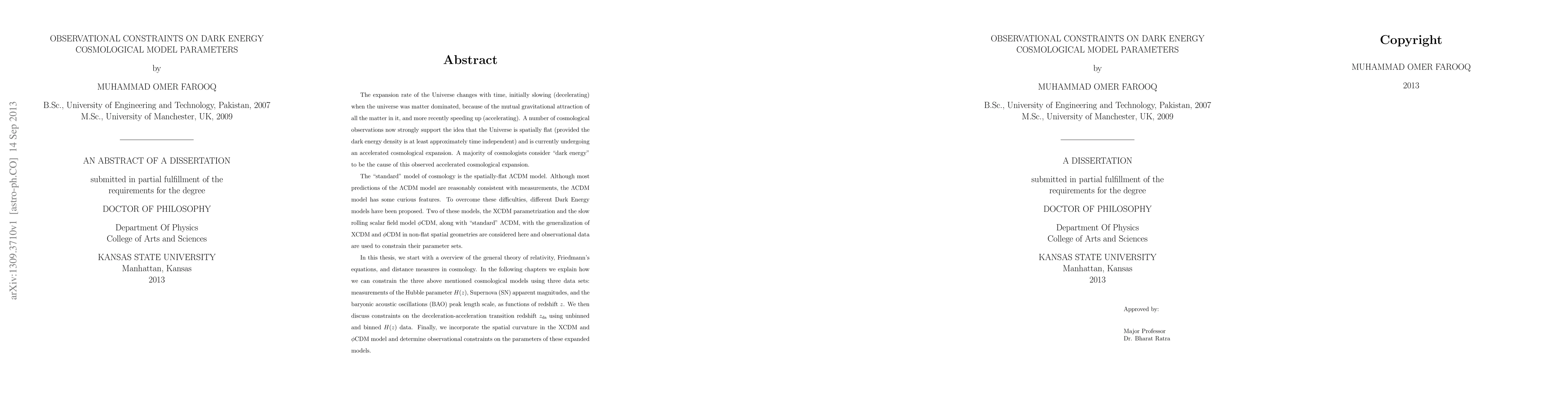 The expansion rate of the Universe changes with time, initially slowing (decelerating) when the universe was matter dominated, because of the mutual gravitational attraction of all the matter in it, and more recently speeding up (accelerating). A number of cosmological observations now strongly support the idea that the Universe is spatially flat (provided the dark energy density is at least approximately time independent) and is currently undergoing an accelerated cosmological expansion. A majority of cosmologists consider "dark energy" to be the cause of this observed accelerated cosmological expansion. The "standard" model of cosmology is the spatially-flat {\Lambda}CDM model. Although most predictions of the {\Lambda}CDM model are reasonably consistent with measurements, the {\Lambda}CDM model has some curious features. To overcome these difficulties, different Dark Energy models have been proposed. Two of these models, the XCDM parametrization and the slow rolling scalar field model $\phi$CDM, along with "standard" {\Lambda}CDM, with the generalization of XCDM and $\phi$CDM in non-flat spatial geometries are considered here and observational data are used to constrain their parameter sets. In this thesis, we start with a overview of the general theory of relativity, Friedmann's equations, and distance measures in cosmology. In the following chapters we explain how we can constrain the three above mentioned cosmological models using three data sets: measurements of the Hubble parameter $H(z)$, Supernova apparent magnitudes, and the BAO peak length scale, as functions of redshift $z$. We then discuss constraints on the deceleration-acceleration transition redshift $z_{\rm da}$ using unbinned and binned $H(z)$ data. Finally, we incorporate the spatial curvature in the XCDM and $\phi$CDM model and determine observational constraints on the parameters of these expanded models.