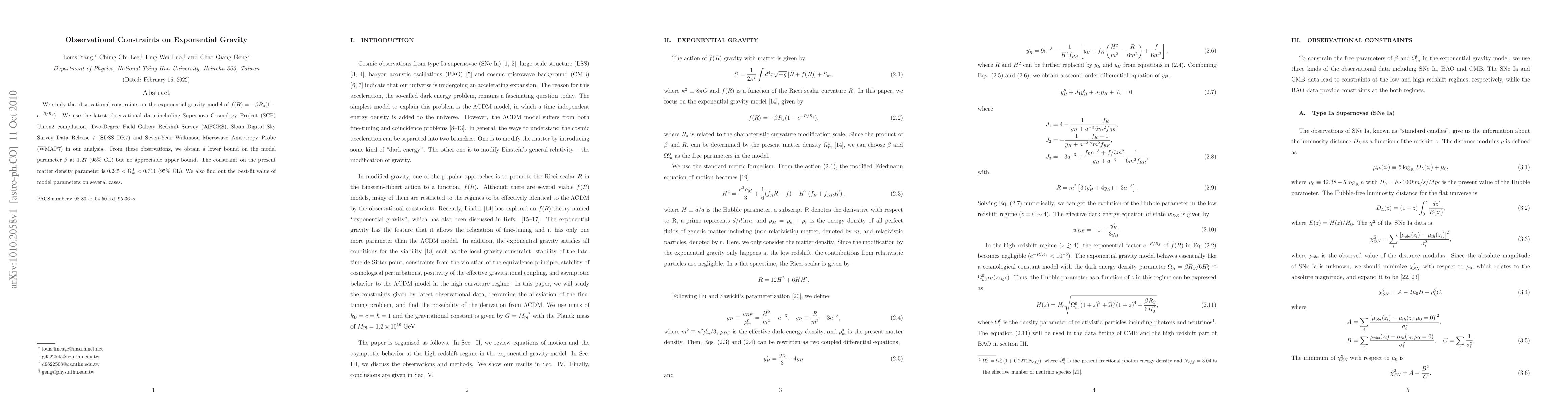 This paper examines the observational constraints on the exponential gravity model f(R)=-beta*Rs(1-e^(-R/Rs)) using recent data from SCP, 2dFGRS, SDSS DR7, and WMAP7. It finds a lower bound for the parameter beta at 1.27 (95% CL) and a matter density range of 0.245< Omega_m^0<0.311 (95% CL).