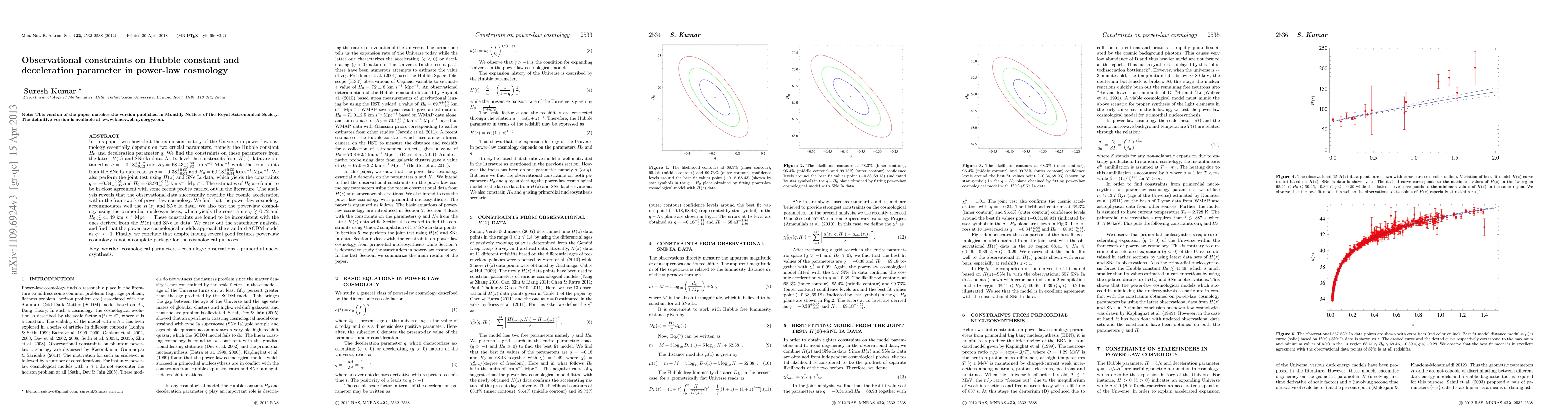 This paper investigates the expansion history of the Universe in power-law cosmology, deriving constraints on the Hubble constant $H_{0}$ and deceleration parameter $q$ from $H(z)$ and SNe Ia data. The results suggest $H_{0}$ around 68-69 km s$^{-1}$ Mpc$^{-1}$ and $q$ around -0.3, indicating cosmic acceleration, but find inconsistencies with primordial nucleosynthesis constraints and conclude that power-law cosmology is not fully compatible with current observations.