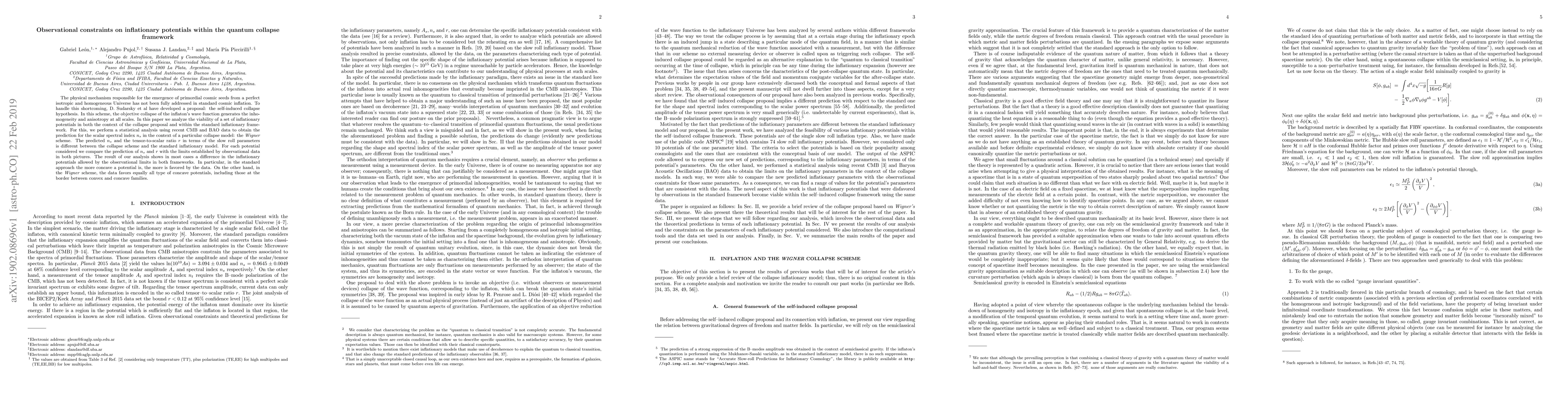 The physical mechanism responsible for the emergence of primordial cosmic seeds from a perfect isotropic and homogeneous Universe has not been fully addressed in standard cosmic inflation. To handle this shortcoming, D. Sudarsky et al have developed a proposal: the self-induced collapse hypothesis. In this scheme, the objective collapse of the inflaton's wave function generates the inhomogeneity and anisotropy at all scales. In this paper we analyze the viability of a set of inflationary potentials in both the context of the collapse proposal and within the standard inflationary framework. For this, we perform a statistical analysis using recent CMB and BAO data to obtain the prediction for the scalar spectral index $n_s$ in the context of a particular collapse model: the Wigner scheme. The predicted $n_s$ and the tensor-to-scalar ratio $r$ in terms of the slow roll parameters is different between the collapse scheme and the standard inflationary model. For each potential considered we compare the prediction of $n_s$ and $r$ with the limits established by observational data in both pictures. The result of our analysis shows in most cases a difference in the inflationary potentials allowed by the observational limits in both frameworks. In particular, in the standard approach the more concave a potential is, the more is favored by the data. On the other hand, in the Wigner scheme, the data favors equally all type of concave potentials, including those at the border between convex and concave families.