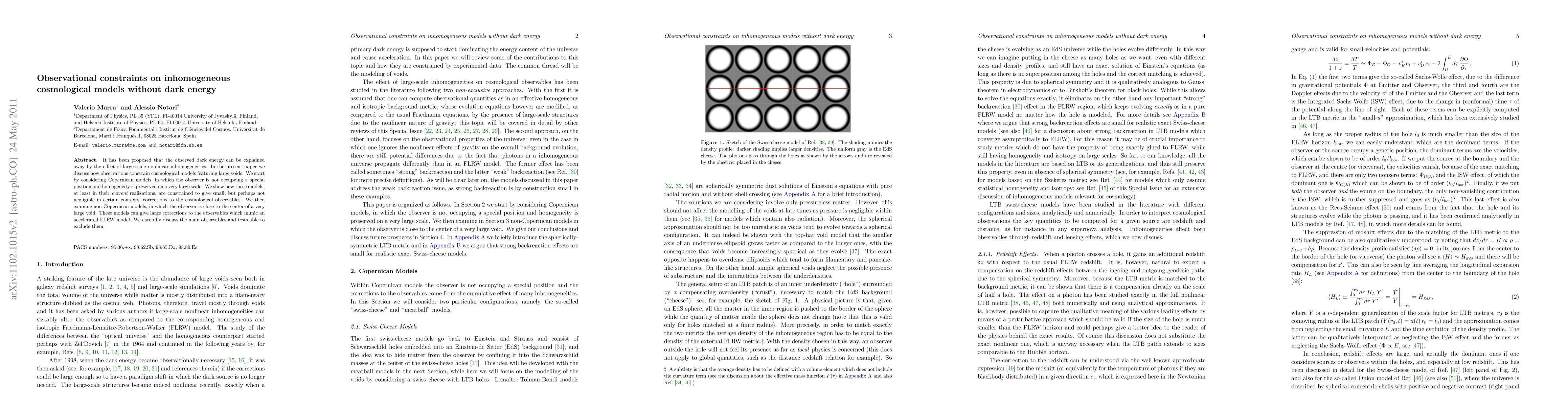 This paper examines observational constraints on cosmological models that do not require dark energy, proposing that large-scale inhomogeneities could explain the observed dark energy effect. It finds that Copernican models, maintaining homogeneity on a large scale, provide small corrections to cosmological observables, while non-Copernican models, placing the observer near a large void, can mimic accelerated expansion but are constrained by current observations.
