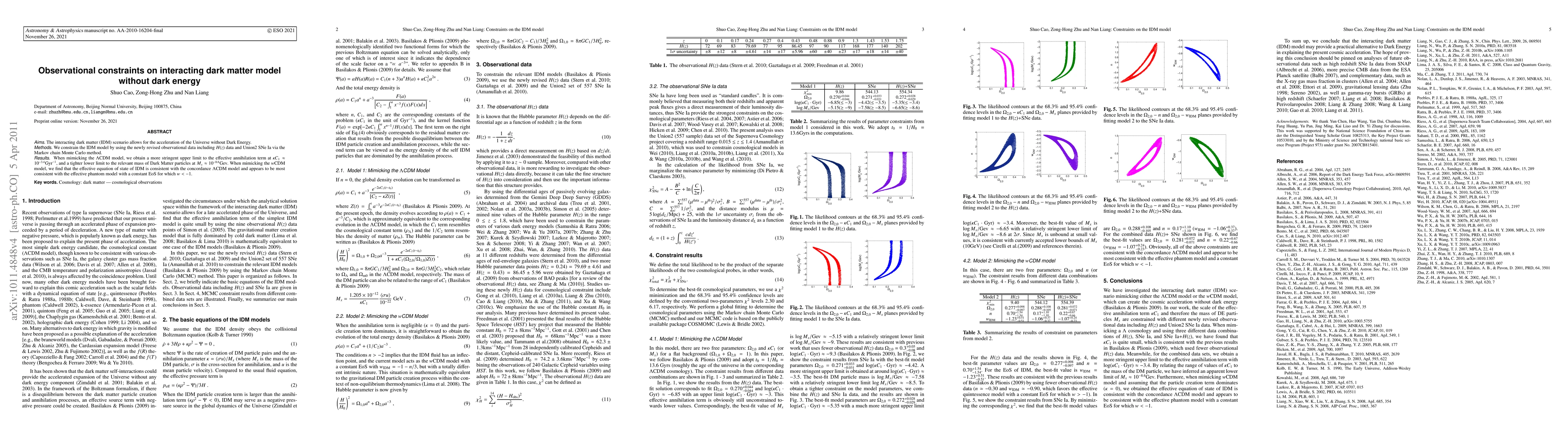 The interacting dark matter (IDM) scenario allows for the acceleration of the Universe without Dark Energy. We constrain the IDM model by using the newly revised observational data including $H(z)$ data and Union2 SNe Ia via the Markov chain Monte Carlo method. When mimicking the $\Lambda$CDM model, we obtain a more stringent upper limit to the effective annihilation term at $\kappa C_1\approx 10^{-3.4}\rm{Gyr}^{-1}$, and a tighter lower limit to the relevant mass of Dark Matter particles at $M_x\approx 10^{-8.6}\rm{Gev}$. When mimicking the $w$CDM model, we find that the effective equation of state of IDM is consistent with the concordance $\Lambda$CDM model and appears to be most consistent with the effective phantom model with a constant EoS for which $w<-1$.