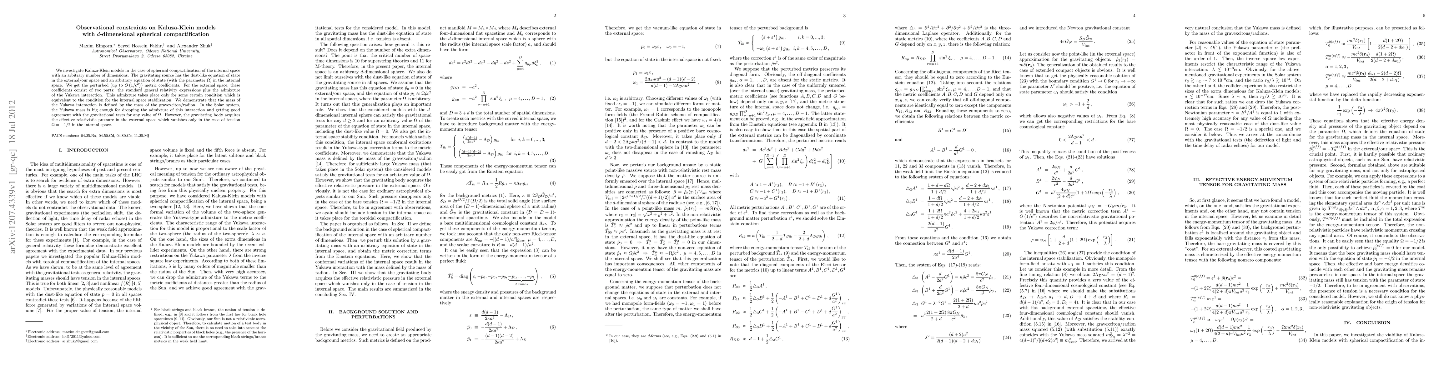 We investigate Kaluza-Klein models in the case of spherical compactification of the internal space with an arbitrary number of dimensions. The gravitating source has the dust-like equation of state in the external/our space and an arbitrary equation of state (with the parameter $\Omega$) in the internal space. We get the perturbed (up to $O(1/c^2)$) metric coefficients. For the external space, these coefficients consist of two parts: the standard general relativity expressions plus the admixture of the Yukawa interaction. This admixture takes place only for some certain condition which is equivalent to the condition for the internal space stabilization. We demonstrate that the mass of the Yukawa interaction is defined by the mass of the gravexciton/radion. In the Solar system, the Yukawa mass is big enough for dropping the admixture of this interaction and getting good agreement with the gravitational tests for any value of $\Omega$. However, the gravitating body acquires the effective relativistic pressure in the external space which vanishes only in the case of tension $\Omega=-1/2$ in the internal space.