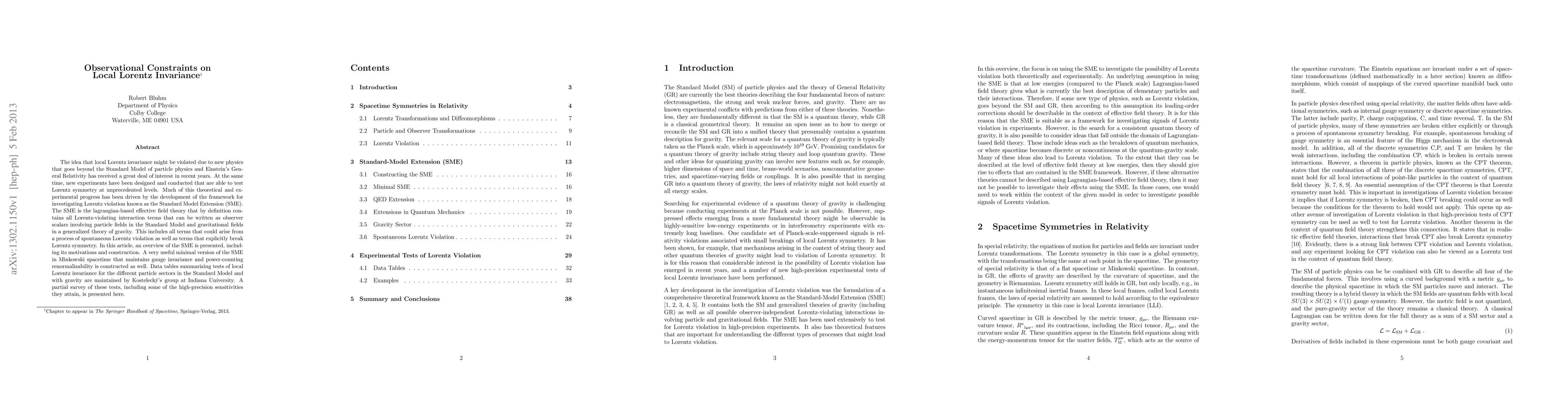 This paper provides an overview of the Standard Model Extension (SME), a framework for investigating Lorentz symmetry violations beyond the Standard Model and General Relativity. It surveys recent experimental tests of local Lorentz invariance, highlighting high-precision experiments and data maintained by Kosteleck\'y's group.