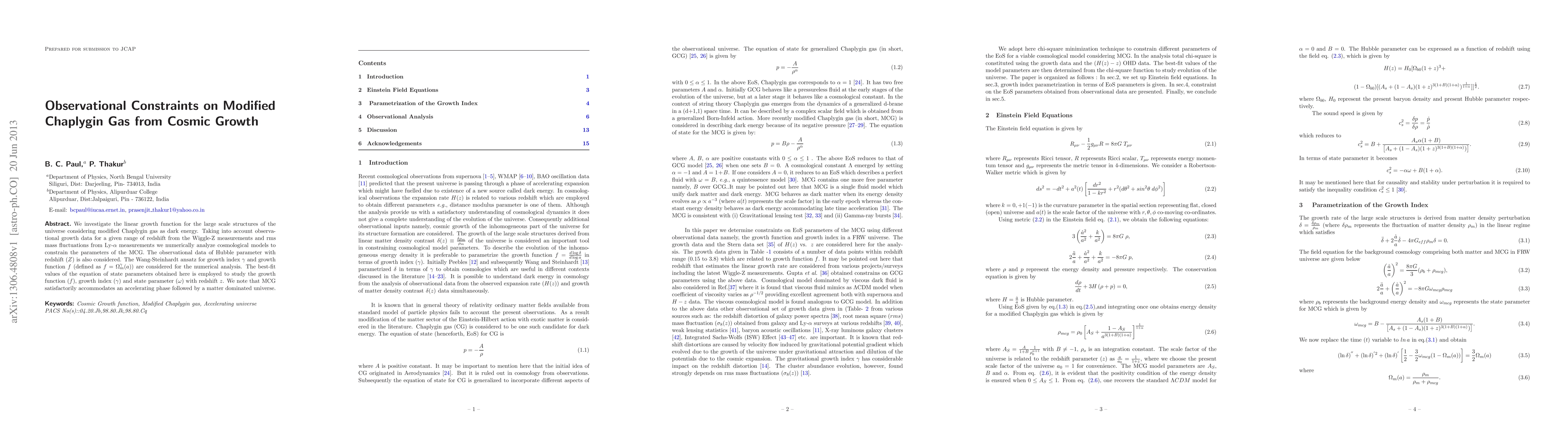 We investigate the linear growth function for the large scale structures of the universe considering modified Chaplygin gas as dark energy. Taking into account observational growth data for a given range of redshift from the Wiggle-Z measurements and rms mass fluctuations from Ly-$\alpha$ measurements we numerically analyze cosmological models to constrain the parameters of the MCG. The observational data of Hubble parameter with redshift ($Z$) is also considered. The Wang-Steinhardt ansatz for growth index $\gamma$ and growth function $f$ (defined as $f=\Omega_{m}^{\gamma} (a)$) are considered for the numerical analysis. The best-fit values of the equation of state parameters obtained here is employed to study the growth function $(f)$, growth index ($\gamma$) and state parameter ($\omega$) with redshift $z$. We note that MCG satisfactorily accommodates an accelerating phase followed by a matter dominated universe.