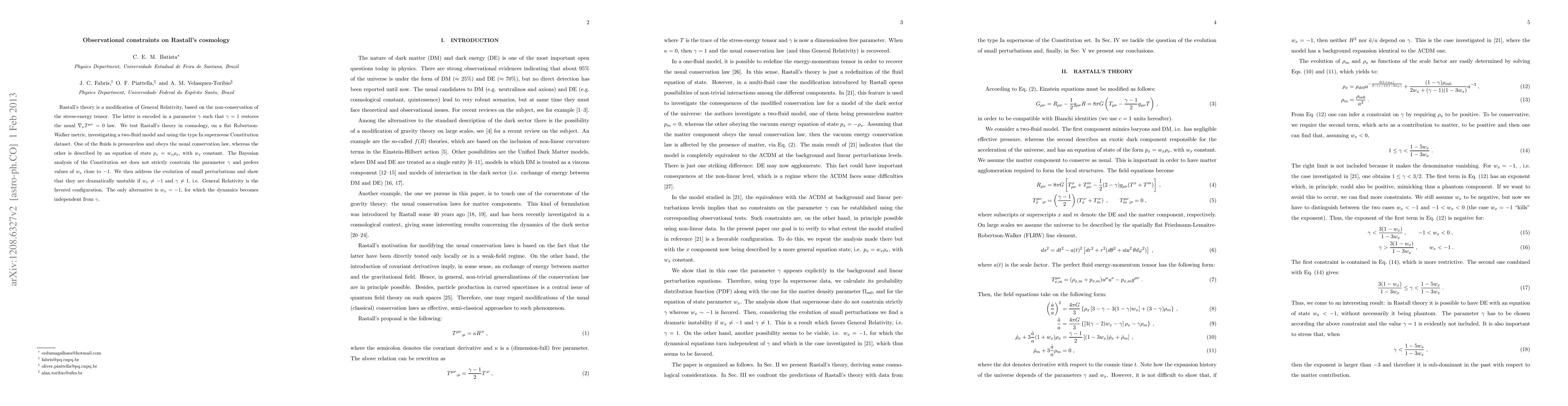 This paper tests Rastall's modified gravity theory against cosmological observations, finding that Bayesian analysis favors $w_x$ close to -1, while small perturbations indicate instability unless General Relativity's conservation law is restored.