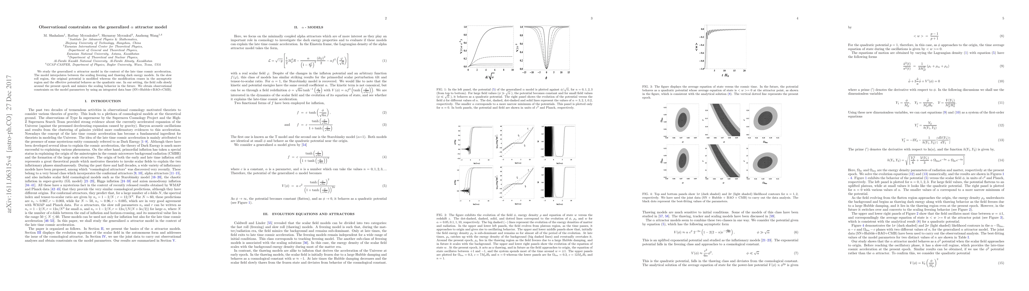 This paper investigates the generalized $\alpha$ attractor model for late-time cosmic acceleration, modifying the original potential in the slow roll region and reverting to a quadratic effective potential asymptotically. Observational constraints on the model parameters are derived using a combined dataset of supernovae, Hubble, baryon acoustic oscillations, and cosmic microwave background data.