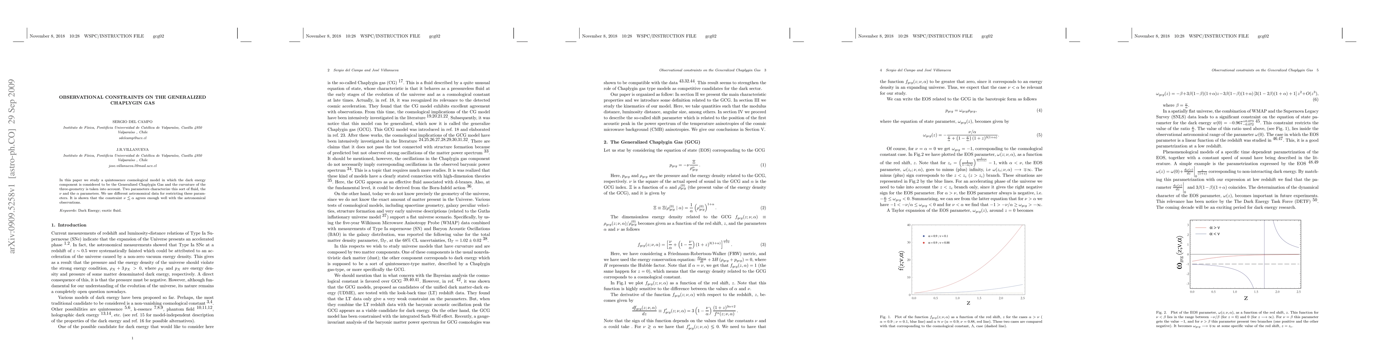 In this paper we study a quintessence cosmological model in which the dark energy component is considered to be the Generalized Chaplygin Gas and the curvature of the three-geometry is taken into account. Two parameters characterize this sort of fluid, the $\nu$ and the $\alpha$ parameters. We use different astronomical data for restricting these parameters. It is shown that the constraint $\nu \lesssim \alpha$ agrees enough well with the astronomical observations.