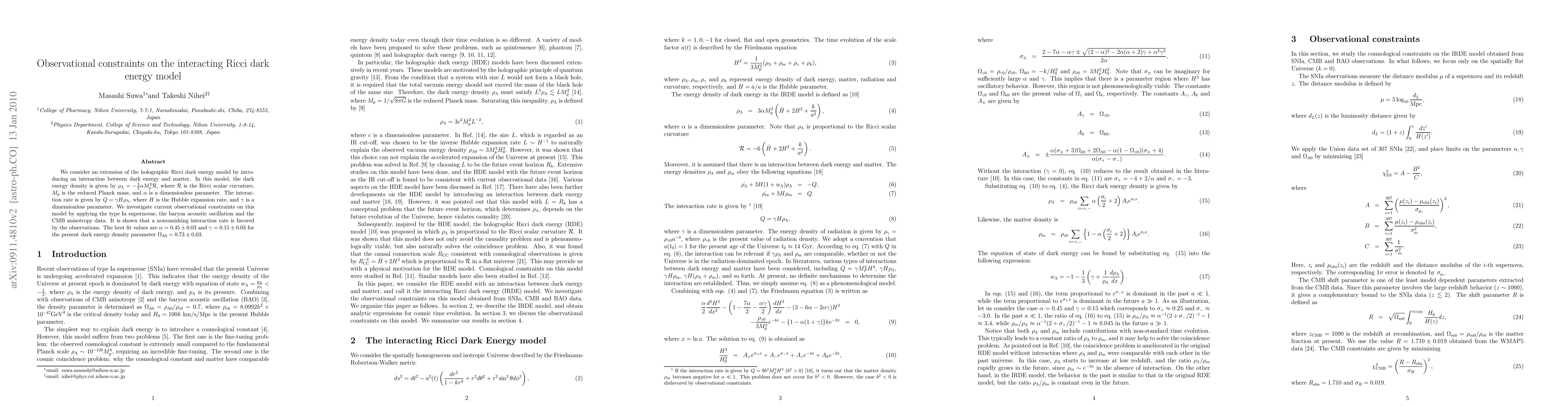 This paper explores an interacting Ricci dark energy model where dark energy density depends on the Ricci scalar curvature and interacts with matter. Observational data from supernovae, baryon acoustic oscillations, and CMB anisotropy suggest a nonvanishing interaction rate, with best fit values of $alpha=0.45 pm 0.03$ and $gamma=0.15 pm 0.03$, supporting a dark energy density parameter of $Omega_{Lambda 0}=0.73 pm0.03$.