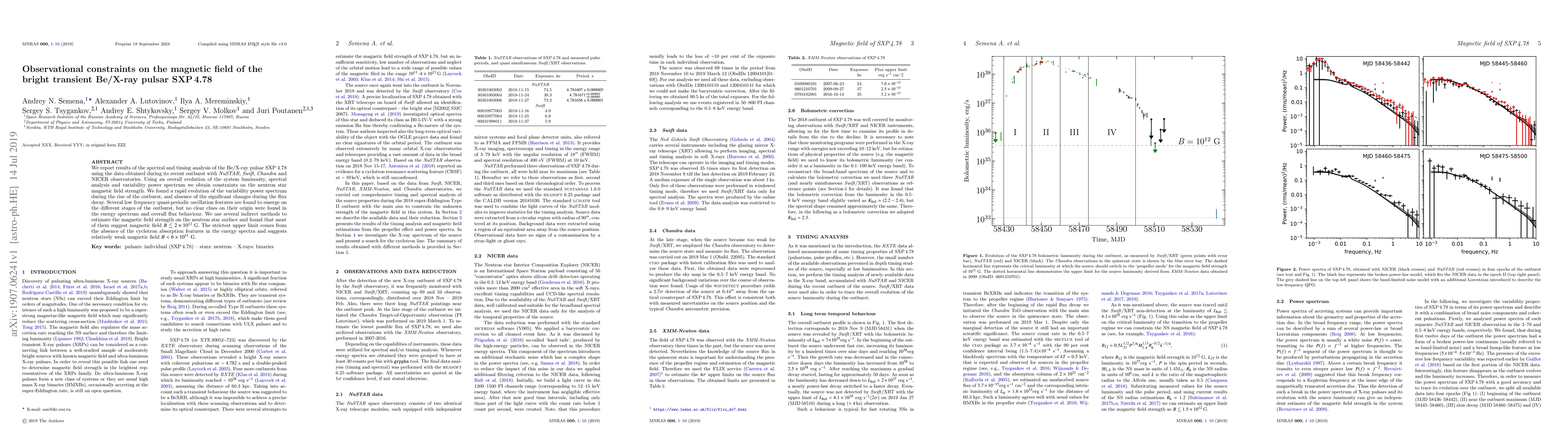 The study analyzes the bright transient Be/X-ray pulsar SXP 4.78 using data from multiple observatories. It finds a rapid change in variability power spectrum during outburst rise, with no significant alterations during decay. Several low-frequency quasi-periodic oscillations emerge, though their origin remains unclear. Using indirect methods, the paper estimates the neutron star's magnetic field to be less than approximately 6 x 10^11 G, with cyclotron absorption feature absence suggesting an even weaker field.