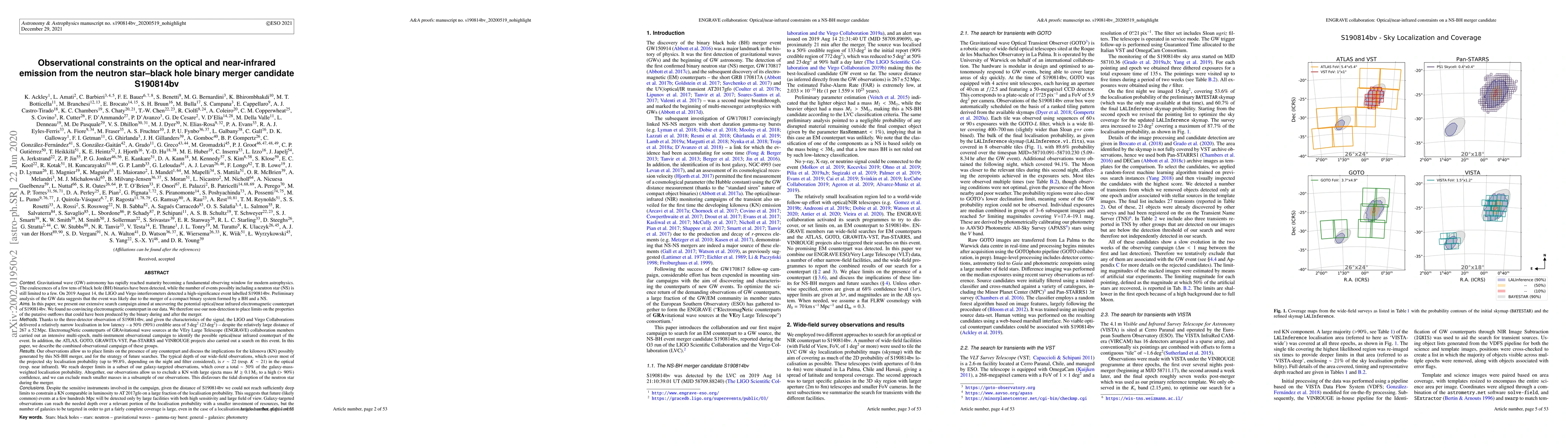 This paper reports on observational constraints from multiple telescopes on the optical and near-infrared emission following the neutron star-black hole merger event S190814bv, finding no evidence of a kilonova with large ejecta mass. The results suggest that future detections of similar events will require large, sensitive facilities.