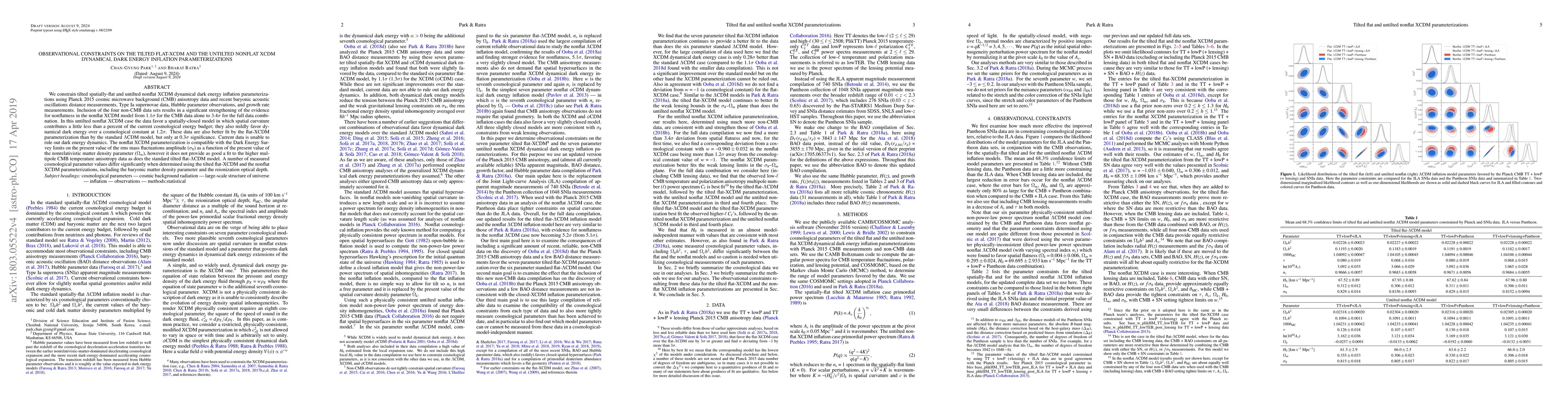 We constrain tilted spatially-flat and untilted nonflat XCDM dynamical dark energy inflation parameterizations using Planck 2015 cosmic microwave background (CMB) anisotropy data and recent baryonic acoustic oscillations distance measurements, Type Ia supernovae data, Hubble parameter observations, and growth rate measurements. Inclusion of the four non-CMB data sets results in a significant strengthening of the evidence for nonflatness in the nonflat XCDM model from 1.1$\sigma$ for the CMB data alone to 3.4$\sigma$ for the full data combination. In this untilted nonflat XCDM case the data favor a spatially-closed model in which spatial curvature contributes a little less than a percent of the current cosmological energy budget; they also mildly favor dynamical dark energy over a cosmological constant at 1.2$\sigma$. These data are also better fit by the flat-XCDM parameterization than by the standard $\Lambda$CDM model, but only at 0.3$\sigma$ significance. Current data is unable to rule out dark energy dynamics. The nonflat XCDM parameterization is compatible with the Dark Energy Survey limits on the present value of the rms mass fluctuations amplitude ($\sigma_8$) as a function of the present value of the nonrelativistic matter density parameter ($\Omega_m$), however it does not provide as good a fit to the higher multipole CMB temperature anisotropy data as does the standard tilted flat-$\Lambda$CDM model. A number of measured cosmological parameter values differ significantly when determined using the tilted flat-XCDM and the nonflat XCDM parameterizations, including the baryonic matter density parameter and the reionization optical depth.