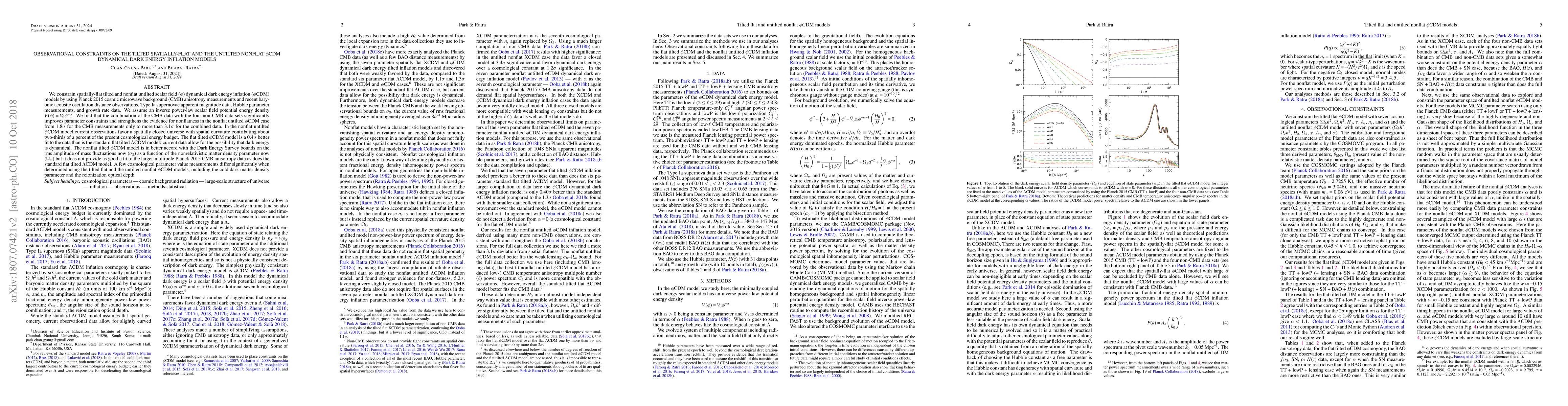 We constrain spatially-flat tilted and nonflat untilted scalar field ($\phi$) dynamical dark energy inflation ($\phi$CDM) models by using Planck 2015 cosmic microwave background (CMB) anisotropy measurements and recent baryonic acoustic oscillation distance observations, Type Ia supernovae apparent magnitude data, Hubble parameter measurements, and growth rate data. We assume an inverse power-law scalar field potential energy density $V(\phi)=V_0 \phi^{-\alpha}$. We find that the combination of the CMB data with the four non-CMB data sets significantly improves parameter constraints and strengthens the evidence for nonflatness in the nonflat untilted $\phi$CDM case from $1.8\sigma$ for the CMB measurements only to more than $3.1\sigma$ for the combined data. In the nonflat untilted $\phi$CDM model current observations favor a spatially closed universe with spatial curvature contributing about two-thirds of a percent of the present cosmological energy budget. The flat tilted $\phi$CDM model is a 0.4$\sigma$ better fit to the data than is the standard flat tilted $\Lambda$CDM model: current data allow for the possibility that dark energy is dynamical. The nonflat tilted $\phi$CDM model is in better accord with the Dark Energy Survey bounds on the rms amplitude of mass fluctuations now ($\sigma_8$) as a function of the nonrelativistic matter density parameter now ($\Omega_m$) but it does not provide as good a fit to the larger-multipole Planck 2015 CMB anisotropy data as does the standard flat tilted $\Lambda$CDM model. A few cosmological parameter value measurements differ significantly when determined using the tilted flat and the untilted nonflat $\phi$CDM models, including the cold dark matter density parameter and the reionization optical depth.