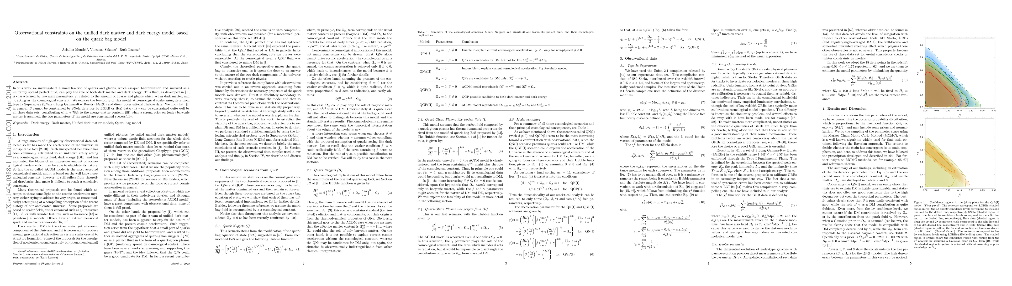 In this work we investigate if a small fraction of quarks and gluons, which escaped hadronization and survived as a uniformly spread perfect fluid, can play the role of both dark matter and dark energy. This fluid, as developed in \citep{Brilenkov}, is characterized by two main parameters: $\beta$, related to the amount of quarks and gluons which act as dark matter; and $\gamma$, acting as the cosmological constant. We explore the feasibility of this model at cosmological scales using data from type Ia Supernovae (SNeIa), Long Gamma-Ray Bursts (LGRB) and direct observational Hubble data. We find that: (i) in general, $\beta$ cannot be constrained by SNeIa data nor by LGRB or H(z) data; (ii) $\gamma$ can be constrained quite well by all three data sets, contributing with $\approx78\%$ to the energy-matter content; (iii) when a strong prior on (only) baryonic matter is assumed, the two parameters of the model are constrained successfully.