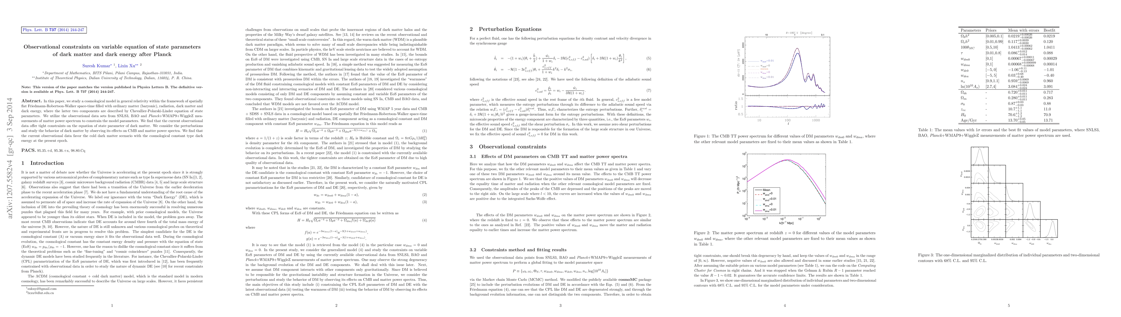 In this paper, we study a cosmological model in general relativity within the framework of spatially flat Friedmann-Robertson-Walker space-time filled with ordinary matter (baryonic), radiation, dark matter and dark energy, where the latter two components are described by Chevallier-Polarski-Linder equation of state parameters. We utilize the observational data sets from SNLS3, BAO and Planck+WMAP9+WiggleZ measurements of matter power spectrum to constrain the model parameters. We find that the current observational data offer tight constraints on the equation of state parameter of dark matter. We consider the perturbations and study the behavior of dark matter by observing its effects on CMB and matter power spectra. We find that the current observational data favor the cold dark matter scenario with the cosmological constant type dark energy at the present epoch.