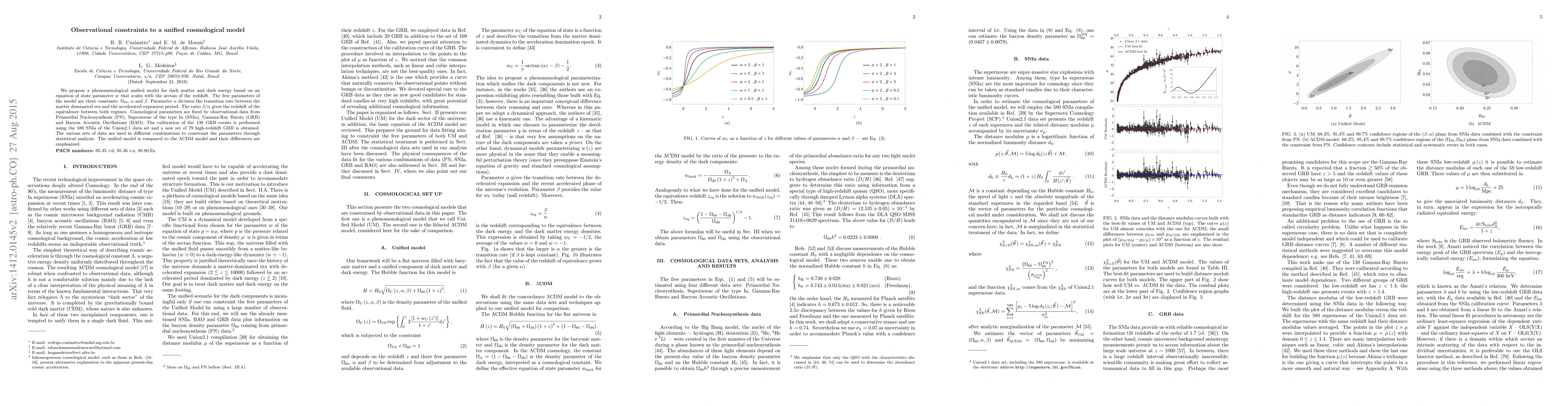 We propose a phenomenological unified model for dark matter and dark energy based on an equation of state parameter $w$ that scales with the $\arctan$ of the redshift. The free parameters of the model are three constants: $\Omega_{b0}$, $\alpha$ and $\beta$. Parameter $\alpha$ dictates the transition rate between the matter dominated era and the accelerated expansion period. The ratio $\beta / \alpha$ gives the redshift of the equivalence between both regimes. Cosmological parameters are fixed by observational data from Primordial Nucleosynthesis (PN), Supernovae of the type Ia (SNIa), Gamma-Ray Bursts (GRB) and Baryon Acoustic Oscillations (BAO). The calibration of the 138 GRBs events is performed using the 580 SNIa of the Union2.1 data set and a new set of 79 high-redshift GRBs is obtained. The various sets of data are used in different combinations to constraint the parameters through statistical analysis. The unified model is compared to the $\Lambda$CDM model and their differences are emphasized.