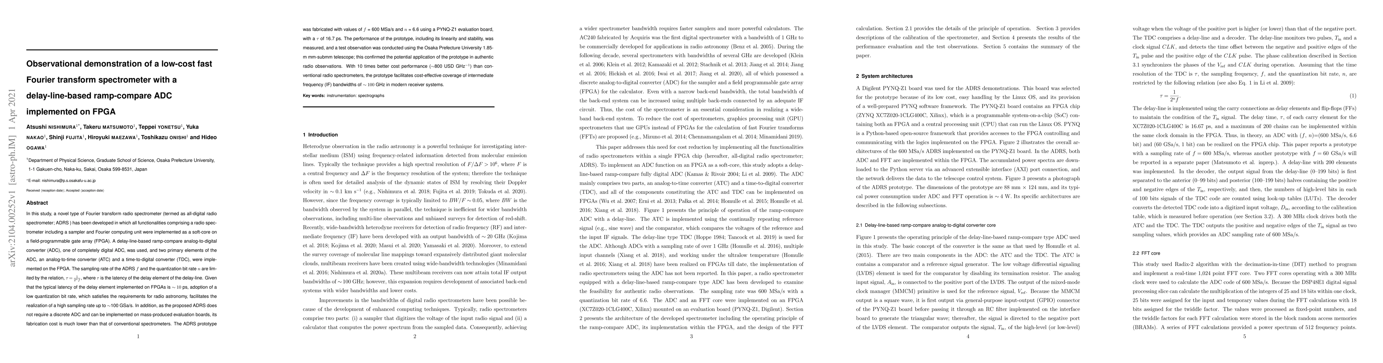 In this study, a novel type of Fourier transform radio spectrometer (termed as all-digital radio spectrometer; ADRS) has been developed in which all functionalities comprising a radio spectrometer including a sampler and Fourier computing unit were implemented as a soft-core on a field-programmable gate array (FPGA). A delay-line-based ramp-compare analog-to-digital converter (ADC), one of completely digital ADC, was used, and two primary elements of the ADC, an analog-to-time converter (ATC) and a time-to-digital converter (TDC), were implemented on the FPGA. The sampling rate of the ADRS $f$ and the quantization bit rate $n$ are limited by the relation, $\tau = \frac{1}{2^{n}f}$, where $\tau$ is the latency of the delay element of the delay-line. Given that the typical latency of the delay element implemented on FPGAs is $\sim10$ ps, adoption of a low quantization bit rate, which satisfies the requirements for radio astronomy, facilitates the realization of a high sampling rate up to $\sim$100 GSa/s. In addition, as the proposed \ADRS does not require a discrete ADC and can be implemented on mass-produced evaluation boards, its fabrication cost is much lower than that of conventional spectrometers. The ADRS prototype was fabricated with values of $f$ = 600 MSa/s and $n$ = 6.6 using a PYNQ-Z1 evaluation board, with a $\tau$ of 16.7 ps. The performance of the prototype, including its linearity and stability, was measured, and a test observation was conducted using the Osaka Prefecture University 1.85-m mm-submm telescope; this confirmed the potential application of the prototype in authentic radio observations. With 10 times better cost performance ($\sim$800 USD GHz$^{-1}$) than conventional radio spectrometers, the prototype facilitates cost-effective coverage of intermediate frequency (IF) bandwidths of $\sim100$ GHz in modern receiver systems.