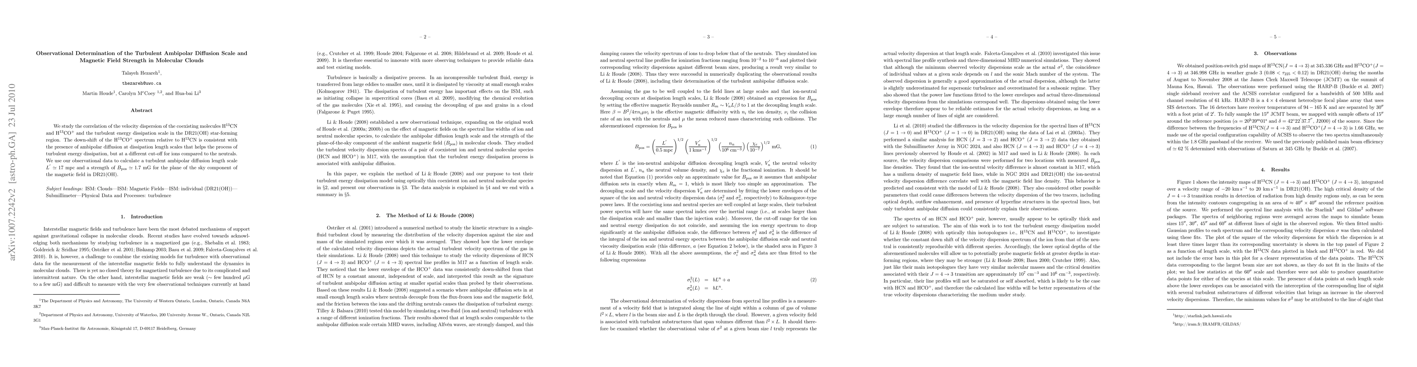 We study the correlation of the velocity dispersion of the coexisting molecules H13CN and H13CO+ and the turbulent energy dissipation scale in the DR21(OH) star-forming region. The down-shift of the H13CO+ spectrum relative to H13CN is consistent with the presence of ambipolar diffusion at dissipation length scales that helps the process of turbulent energy dissipation, but at a different cut-off for ions compared to the neutrals. We use our observational data to calculate a turbulent ambipolar diffusion length scale L'\simeq17 mpc and a strength of B_{pos}\simeq1.7 mG for the plane of the sky component of the magnetic field in DR21(OH).