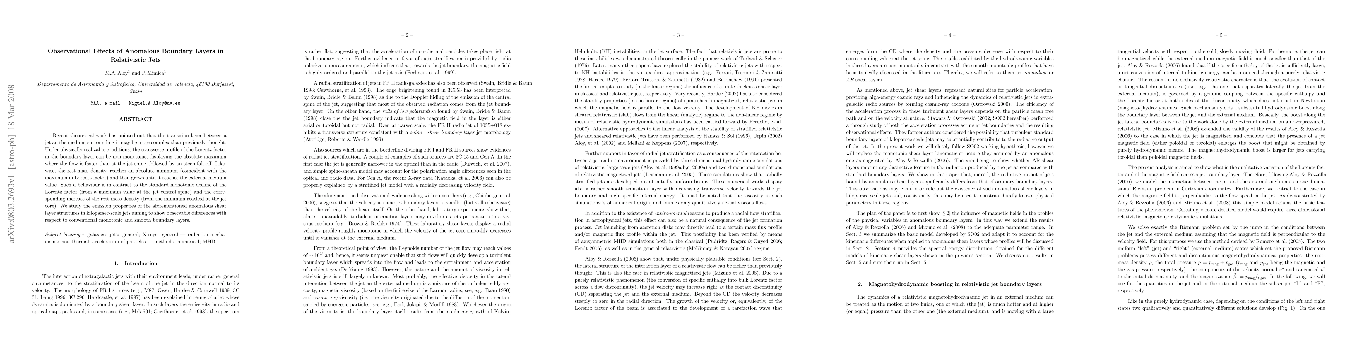 This paper investigates the complex, non-monotonic behavior of boundary layers in relativistic jets, where the Lorentz factor peaks and then sharply declines, and rest-mass density reaches a minimum before increasing. The study aims to identify observable differences in emission properties compared to conventional smooth boundary layers.