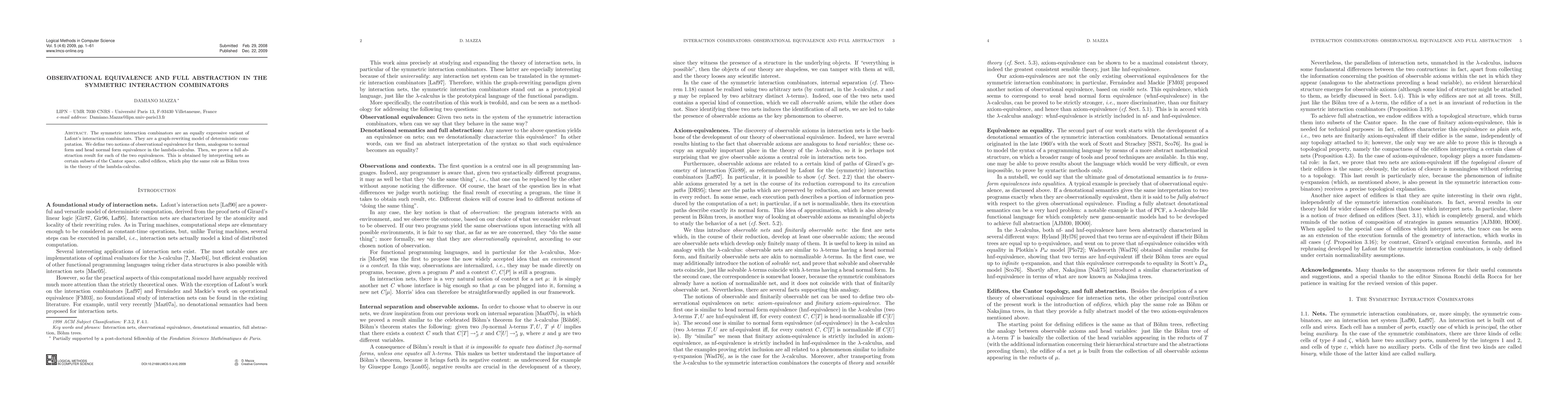 This paper introduces symmetric interaction combinators, a variant of Lafont's interaction combinators for deterministic computation, and establishes two observational equivalences. The authors prove full abstraction for these equivalences by interpreting nets as edifices in the Cantor space, analogous to Boehm trees in lambda calculus.