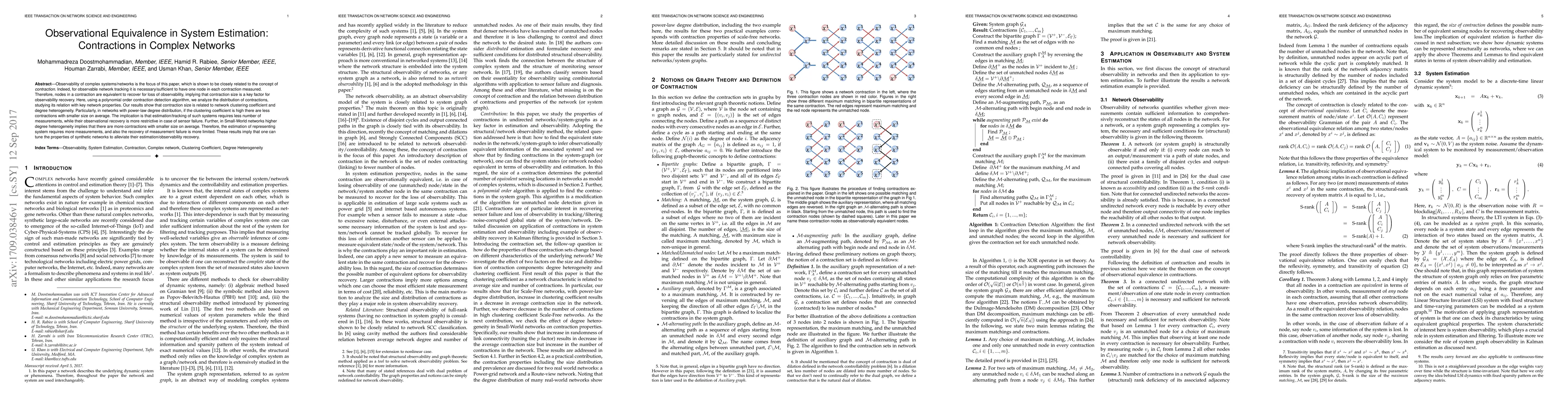 Observability of complex systems/networks is the focus of this paper, which is shown to be closely related to the concept of contraction. Indeed, for observable network tracking it is necessary/sufficient to have one node in each contraction measured. Therefore, nodes in a contraction are equivalent to recover for loss of observability, implying that contraction size is a key factor for observability recovery. Here, using a polynomial order contraction detection algorithm, we analyze the distribution of contractions, studying its relation with key network properties. Our results show that contraction size is related to network clustering coefficient and degree heterogeneity. Particularly, in networks with power-law degree distribution, if the clustering coefficient is high there are less contractions with smaller size on average. The implication is that estimation/tracking of such systems requires less number of measurements, while their observational recovery is more restrictive in case of sensor failure. Further, in Small-World networks higher degree heterogeneity implies that there are more contractions with smaller size on average. Therefore, the estimation of representing system requires more measurements, and also the recovery of measurement failure is more limited. These results imply that one can tune the properties of synthetic networks to alleviate their estimation/observability recovery.