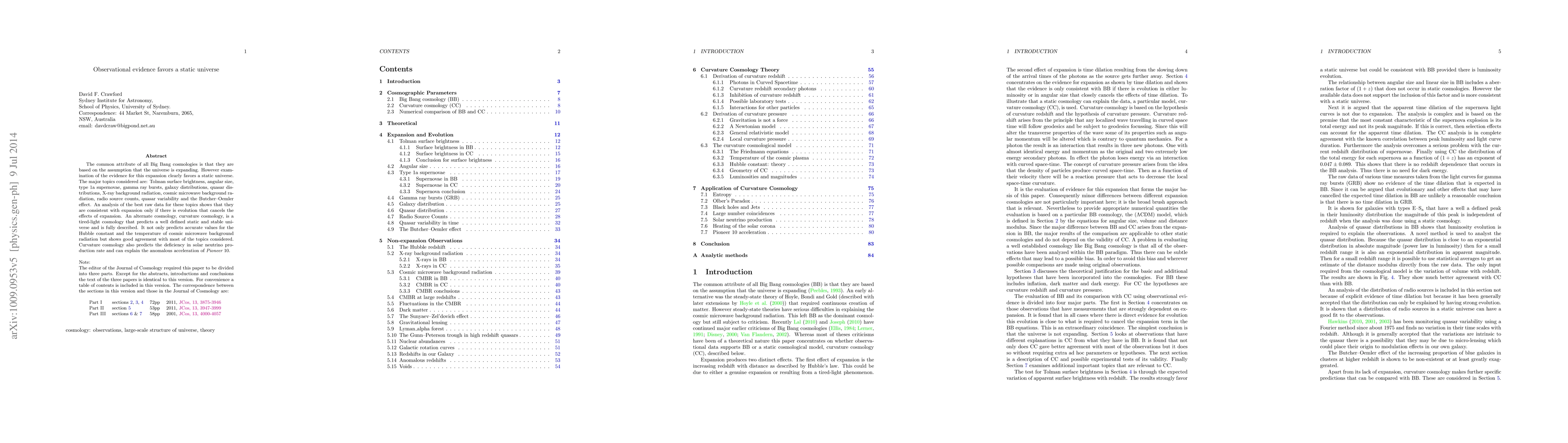 This paper argues that observational evidence supports a static universe over the expanding universe model, proposing an alternate "curvature cosmology" that aligns well with raw data and predicts accurate values for the Hubble constant and cosmic microwave background radiation temperature. The tired-light model also explains phenomena like solar neutrino production and the Pioneer 10 anomaly.