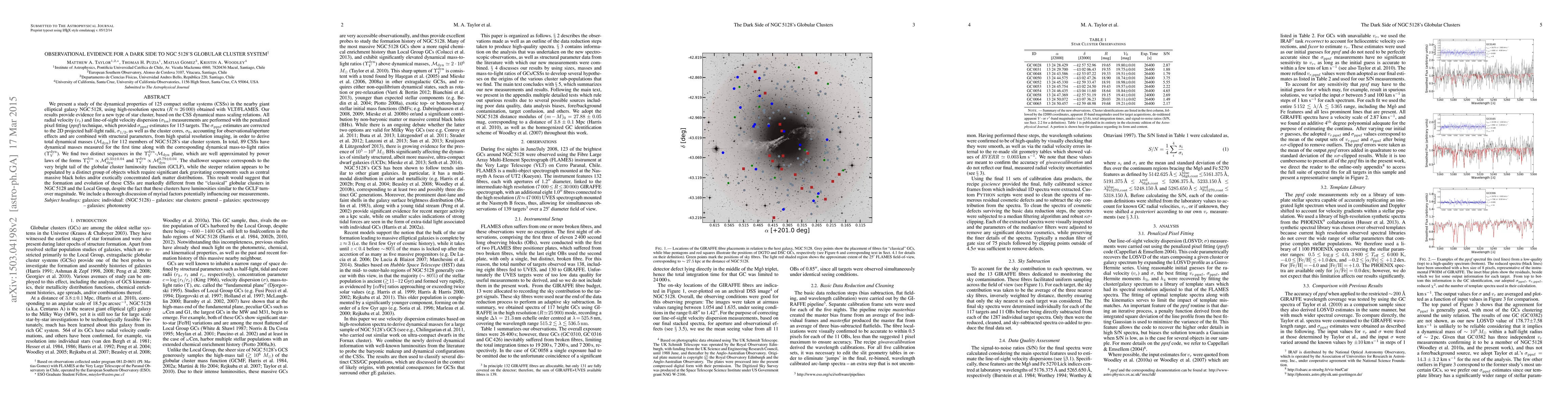 This study uses high-resolution spectra from VLT/FLAMES to analyze 125 compact stellar systems in NGC5128, revealing two distinct dynamical mass sequences. The shallower sequence corresponds to bright globular clusters, while the steeper one suggests the presence of dark components like black holes or dark matter in a distinct cluster group, indicating unique formation and evolution compared to typical globular clusters.