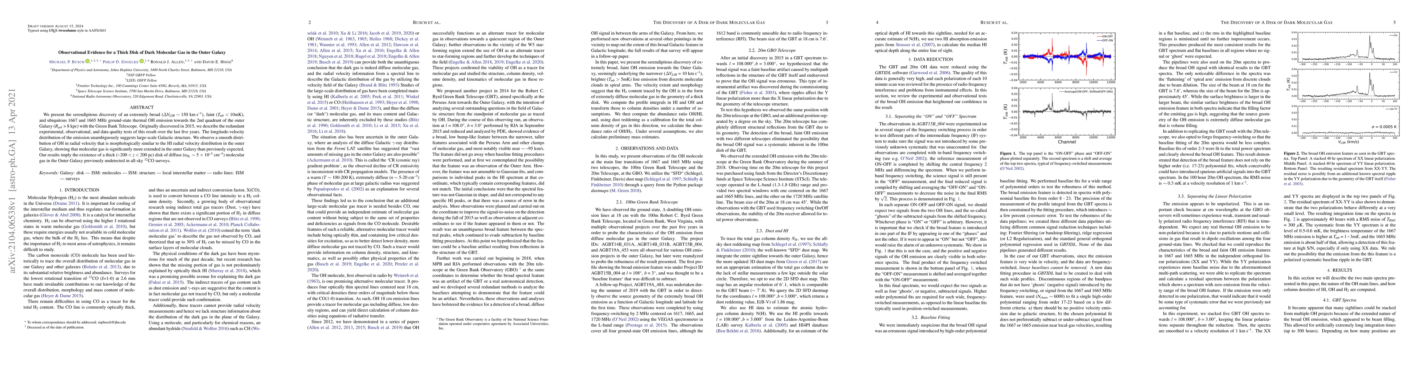 We present the serendipitous discovery of an extremely broad ($\Delta V_{LSR} \sim 150$ km/s), faint ($T_{mb} < 10 \textrm{mK}$), and ubiquitous 1667 and 1665 MHz ground-state thermal OH emission towards the 2nd quadrant of the outer Galaxy ($R_{gal}$ > 8 kpc) with the Green Bank Telescope. Originally discovered in 2015, we describe the redundant experimental, observational, and data quality tests of this result over the last five years. The longitude-velocity distribution of the emission unambiguously suggests large-scale Galactic structure. We observe a smooth distribution of OH in radial velocity that is morphologically similar to the HI radial velocity distribution in the outer Galaxy, showing that molecular gas is significantly more extended in the outer Galaxy than previously expected. Our results imply the existence of a thick ($-200< z < 200$ pc) disk of diffuse ($n_{H_{2}}$ $\sim$ 5 $\times$ 10$^{-3}$ cm$^{-3}$) molecular gas in the Outer Galaxy previously undetected in all-sky CO surveys.