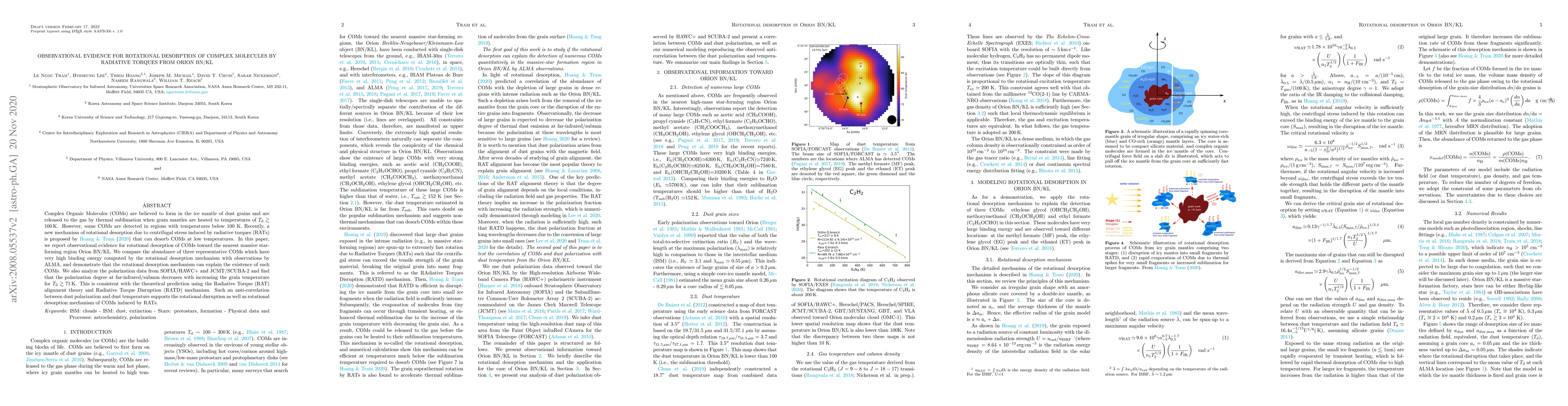 This paper provides observational evidence for the rotational desorption of complex organic molecules (COMs) in the Orion BN/KL region via radiative torques, demonstrating that this mechanism can release COMs at temperatures below 100 K. The study supports this theory through ALMA observations and polarization data analysis, showing an anti-correlation between dust polarization and temperature consistent with the RAT disruption mechanism.