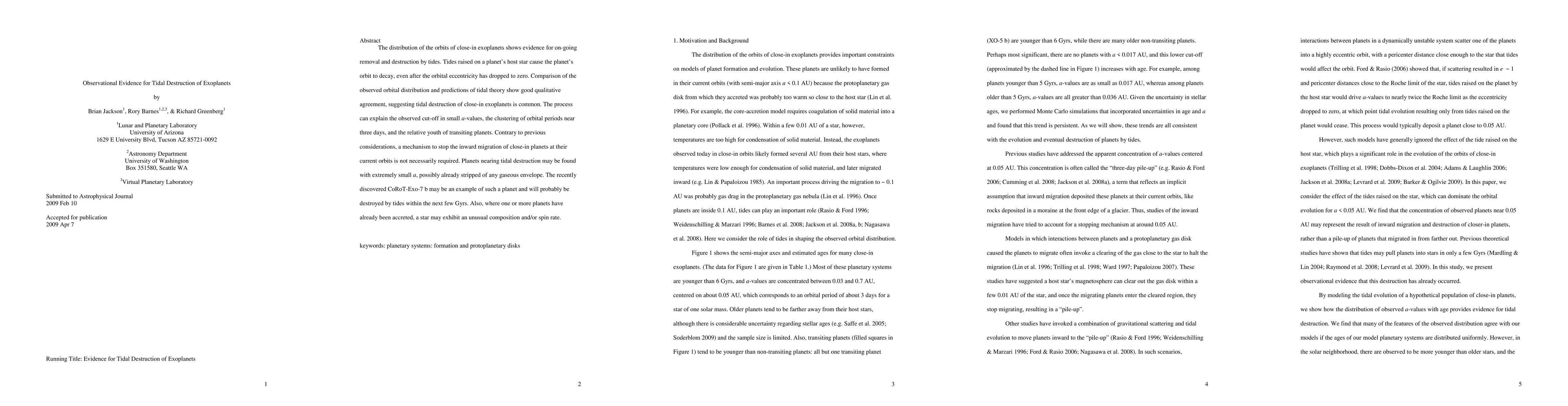 This paper presents observational evidence supporting the tidal destruction of close-in exoplanets, showing that tidal forces from host stars cause orbital decay and eventual destruction. The findings suggest that tidal destruction is a common process explaining observed orbital characteristics and the absence of planets with very small semi-major axes.