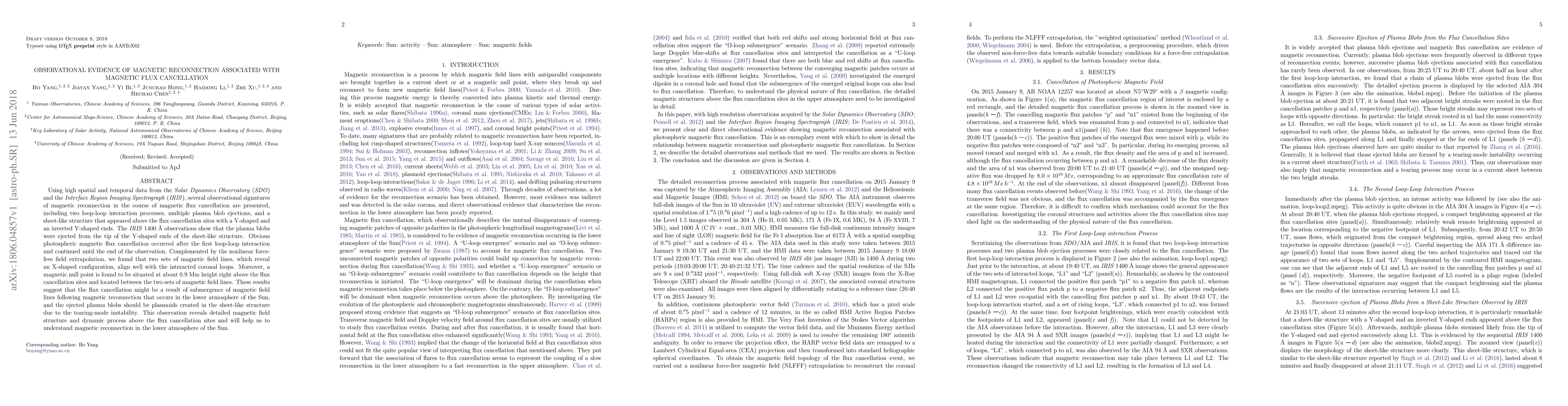 This paper uses data from the \emph{SDO} and \emph{IRIS} to observe magnetic reconnection during flux cancellation, revealing loop-loop interactions, plasma ejections, and a Y-shaped sheet-like structure. The findings suggest that flux cancellation results from reconnection in the Sun's lower atmosphere, with ejected plasma blobs forming due to tearing-mode instability.