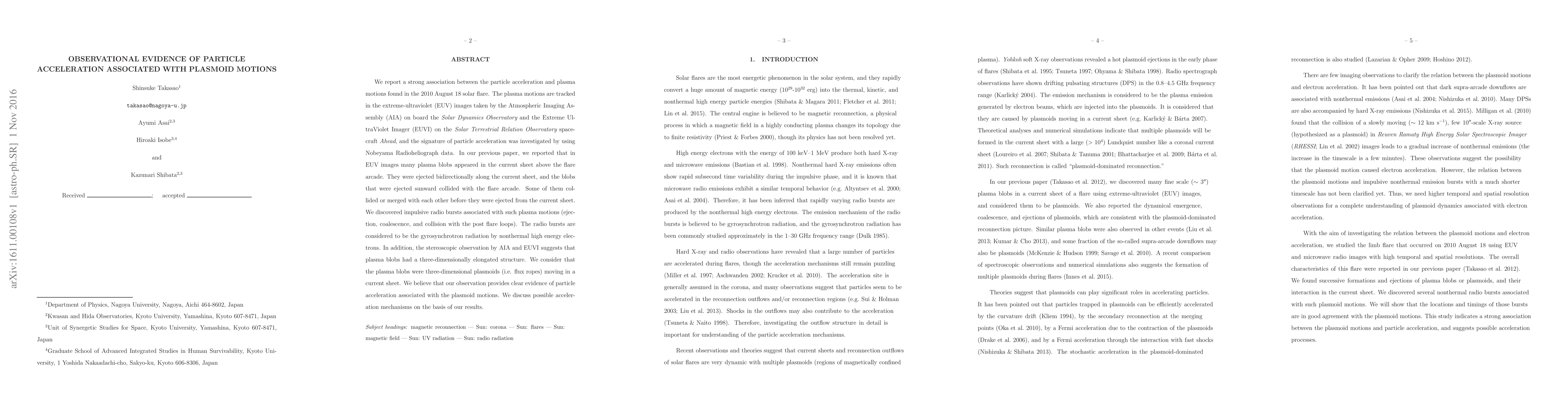 This research identifies a strong link between particle acceleration and plasma movements in the 2010 August 18 solar flare. Using data from the Atmospheric Imaging Assembly (AIA), Extreme UltraViolet Imager (EUVI), and Nobeyama Radioheliograph, the study found that plasma blobs (three-dimensional plasmoids) in the current sheet above the flare arcade were ejected bidirectionally, collided, and merged. These events were associated with impulsive radio bursts, interpreted as gyrosynchrotron radiation from nonthermal high-energy electrons. The findings offer evidence of particle acceleration tied to plasmoid motions, with discussions on possible acceleration mechanisms.