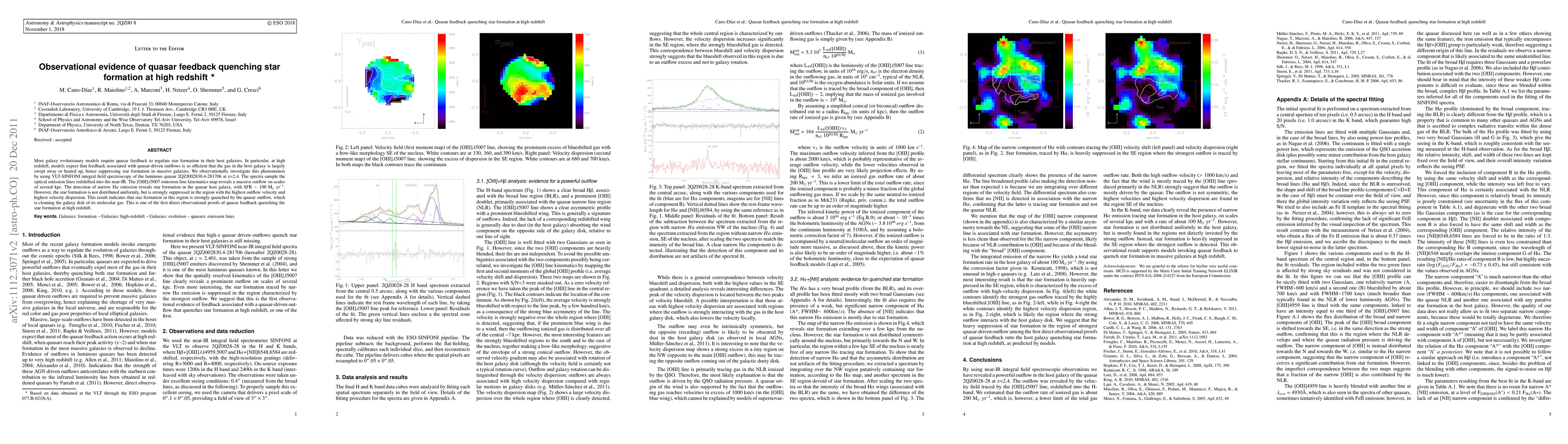 This paper presents evidence that quasar feedback at high redshift can quench star formation in host galaxies. Using VLT-SINFONI spectroscopy, the study observes a luminous quasar outflow that suppresses star formation in the galaxy's disk, providing direct observational proof of this phenomenon.