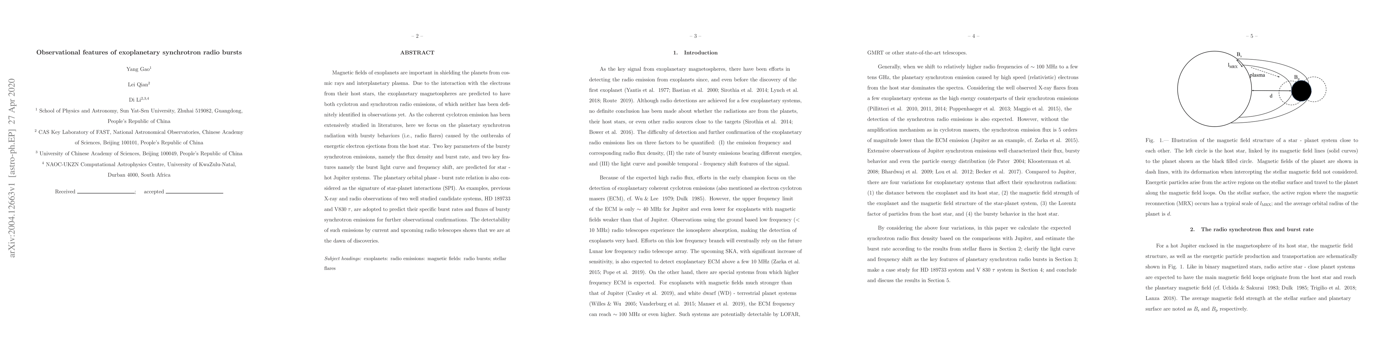 This paper investigates the potential for detecting synchrotron radio bursts from exoplanets, focusing on their bursty behaviors and key parameters like flux density and burst rate. It predicts specific burst rates and fluxes for the star-hot Jupiter systems HD 189733 and V830 τ, highlighting the detectability of these emissions by current and future radio telescopes.