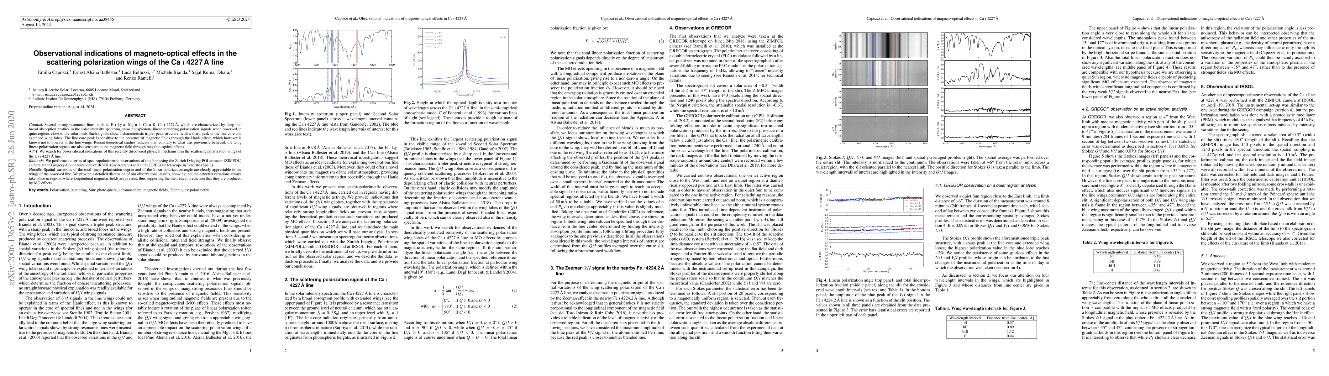 This paper investigates the magneto-optical effects observed in the scattering polarization wings of the Ca I 4227 Å line, revealing significant spatial variations in polarization degree and angle. The findings support theoretical predictions that these variations are produced by magneto-optical effects in regions with longitudinal magnetic fields.