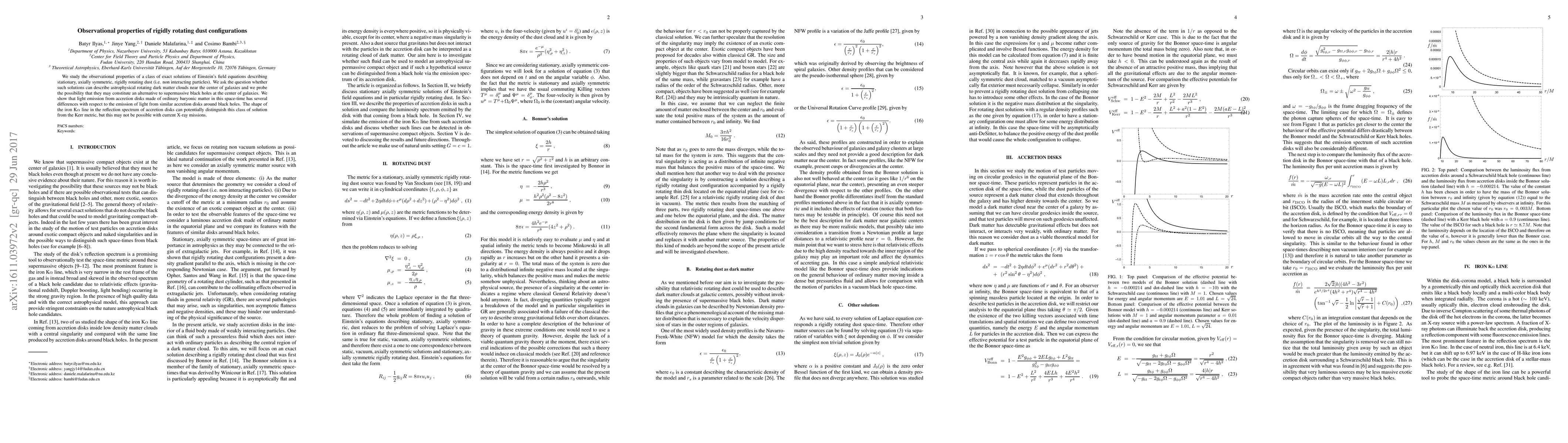 This paper investigates the observational properties of rigidly rotating dust configurations in Einstein's field equations, exploring their potential to describe astrophysical rotating dark matter clouds near galactic centers. It finds that light emission from accretion disks in this space-time differs from that around black holes, with the iron K$\alpha$ line potentially distinguishing these configurations, though current X-ray missions may not be sufficient.