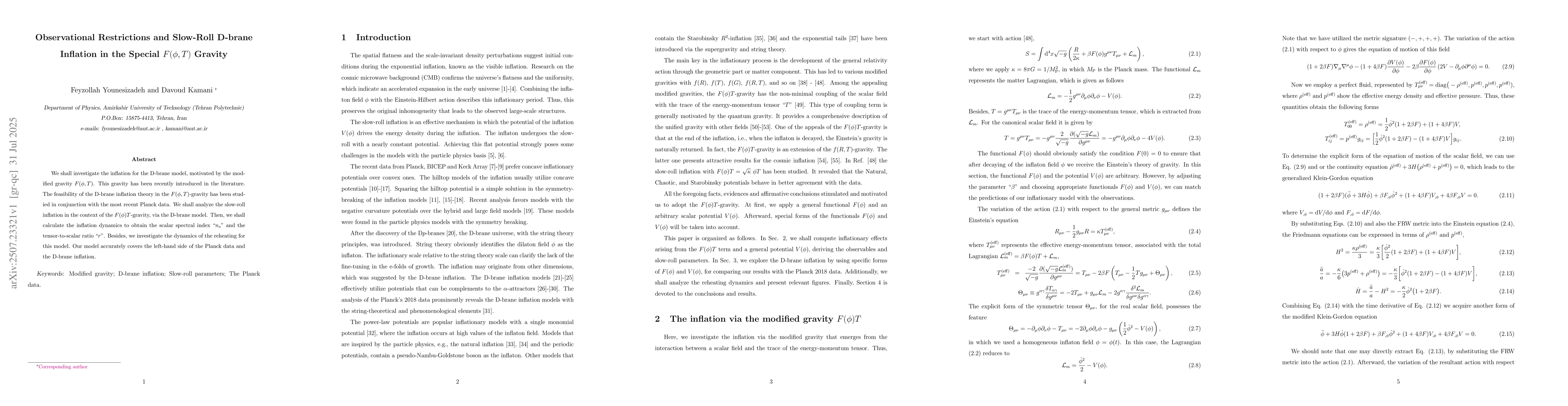 We shall investigate the inflation for the D-brane model, motivated by the modified gravity $F(\phi,T)$. This gravity has been recently introduced in the literature. The feasibility of the D-brane inflation theory in the $F(\phi,T)$-gravity has been studied in conjunction with the most recent Planck data. We shall analyze the slow-roll inflation in the context of the $F(\phi)T$-gravity, via the D-brane model. Then, we shall calculate the inflation dynamics to obtain the scalar spectral index ``$n_s$'' and the tensor-to-scalar ratio ``$r$''. Besides, we investigate the dynamics of the reheating for this model. Our model accurately covers the left-hand side of the Planck data and the D-brane inflation.
