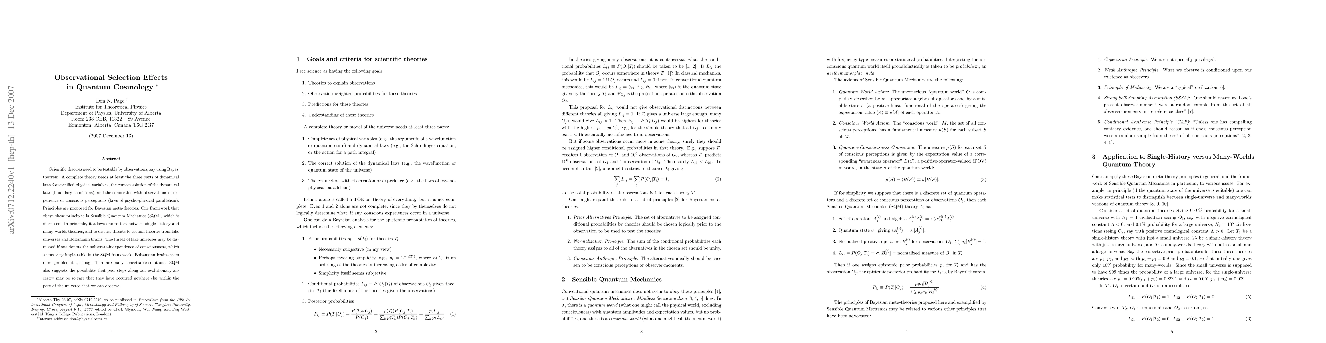 Scientific theories need to be testable by observations, say using Bayes' theorem. A complete theory needs at least the three parts of dynamical laws for specified physical variables, the correct solution of the dynamical laws (boundary conditions), and the connection with observations or experience or conscious perceptions (laws of psycho-physical parallelism). Principles are proposed for Bayesian meta-theories. One framework that obeys these principles is Sensible Quantum Mechanics (SQM), which is discussed. In principle, it allows one to test between single-history and many-worlds theories, and to discuss threats to certain theories from fake universes and Boltzmann brains. The threat of fake universes may be dismissed if one doubts the substrate-independence of consciousness, which seems very implausible in the SQM framework. Boltzmann brains seem more problematic, though there are many conceivable solutions. SQM also suggests the possibility that past steps along our evolutionary ancestry may be so rare that they have occurred nowhere else within the part of the universe that we can observe.