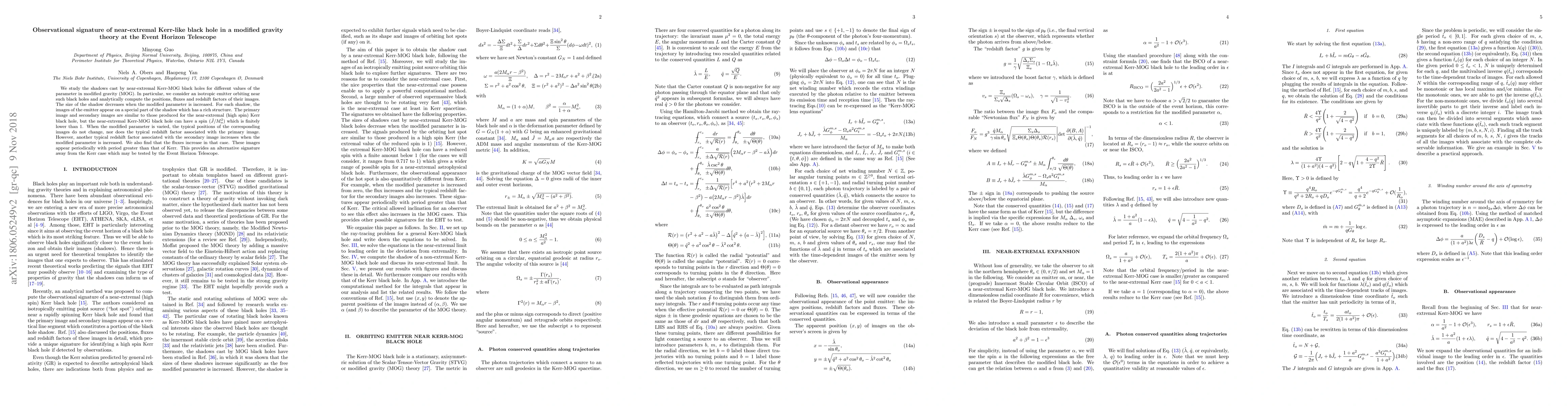 We study the shadows cast by near-extremal Kerr-MOG black holes for different values of the parameter in modified gravity (MOG). In particular, we consider an isotropic emitter orbiting near such black holes and analytically compute the positions, fluxes and redshift factors of their images. The size of the shadow decreases when the modified parameter is increased. For each shadow, the images of the emitter appear on a special part of the shadow which has a rich structure. The primary image and secondary images are similar to those produced for the near-extremal (high spin) Kerr black hole, but the near-extremal Kerr-MOG black hole can have a spin ($\hat{J}/M^2_{\alpha}$) which is finitely lower than 1. When the modified parameter is varied, the typical positions of the corresponding images do not change, nor does the typical redshift factor associated with the primary image. However, another typical redshift factor associated with the secondary image increases when the modified parameter is increased. We also find that the fluxes increase in that case. These images appear periodically with period greater than that of Kerr. This provides an alternative signature away from the Kerr case which may be tested by the Event Horizon Telescope.