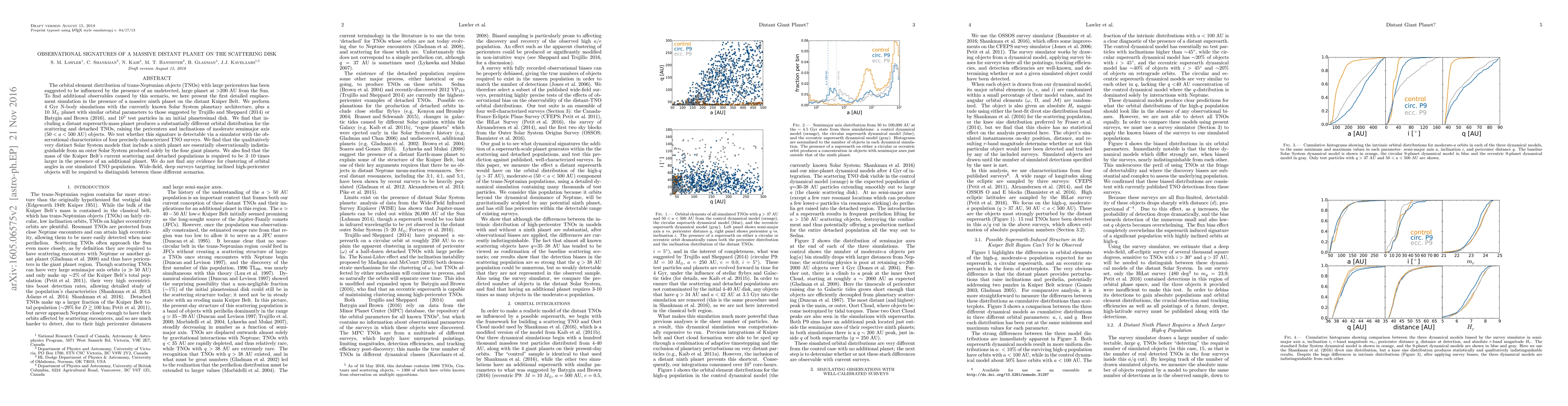This study simulates the Solar System's evolution with a hypothetical massive planet, finding that while such a planet could influence the orbits of distant Kuiper Belt objects, current observations can't distinguish this scenario from the known giant planets' effects alone. The research suggests wide-field, deep surveys targeting inclined high-pericenter objects are needed for discrimination.