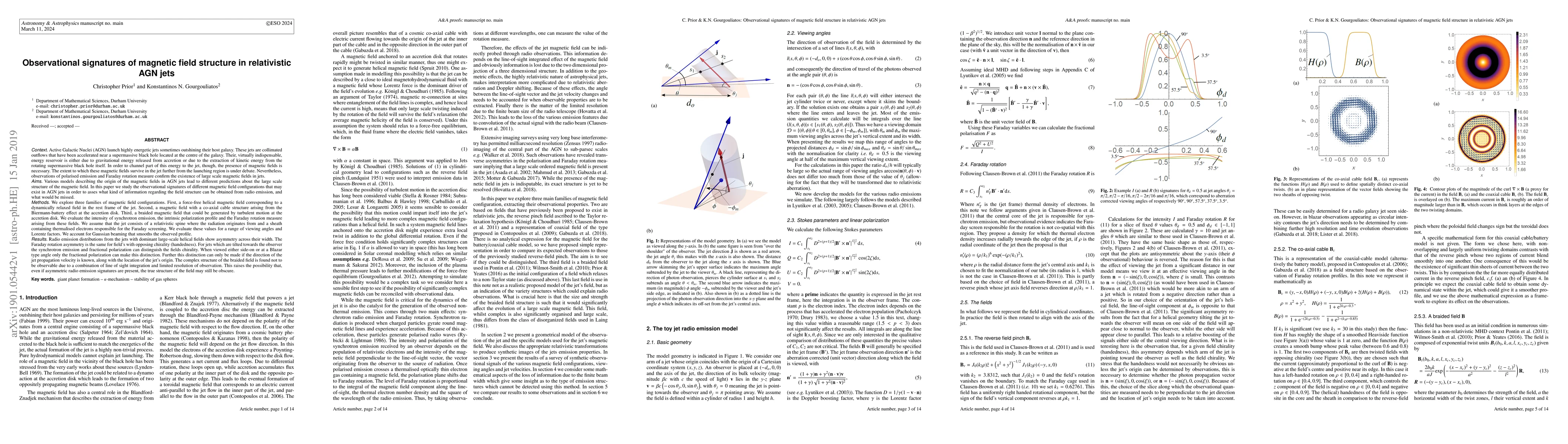 This paper investigates the observational signatures of magnetic field structures in relativistic jets from Active Galactic Nuclei (AGN), finding that large-scale helical fields cause asymmetry in radio emissions. The study concludes that while the chirality of magnetic fields can be discerned through synchrotron emission and fractional polarization, the true complexity of the magnetic field structure remains elusive due to observational limitations.