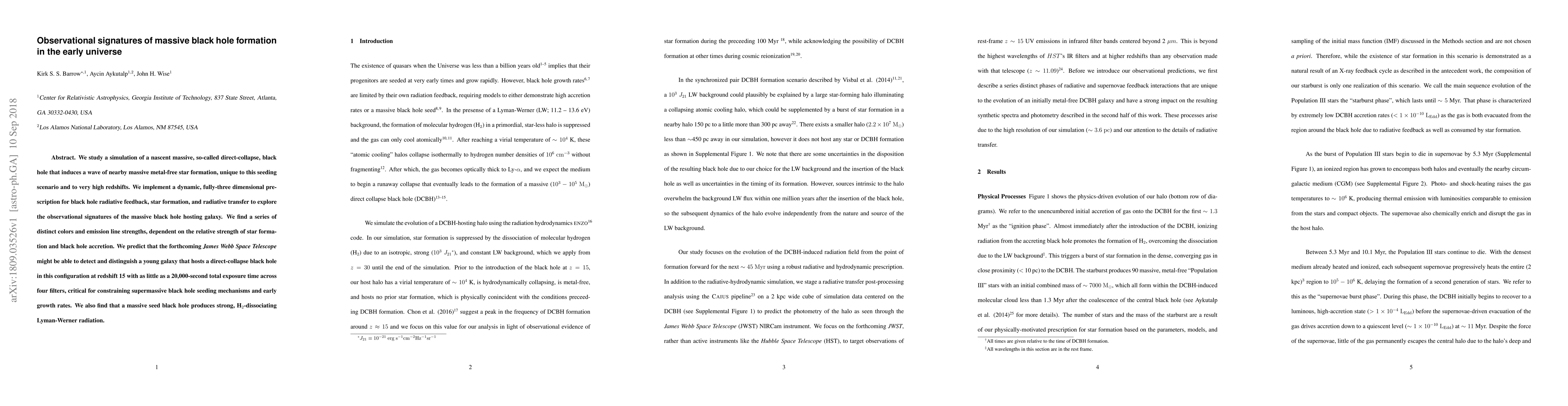 Space telescope observations of massive black holes during their formation may be key to understanding the origin of supermassive black holes and high-redshift quasars. To create diagnostics for their detection and confirmation, we study a simulation of a nascent massive, so-called direct-collapse, black hole that induces a wave of nearby massive metal-free star formation, unique to this seeding scenario and to very high redshifts. Here we describe a series of distinct colors and emission line strengths, dependent on the relative strength of star formation and black hole accretion. We predict that the forthcoming James Webb Space Telescope might be able to detect and distinguish a young galaxy that hosts a direct-collapse black hole in this configuration at redshift 15 with as little as a 20,000-second total exposure time across four filters, critical for constraining supermassive black hole seeding mechanisms and early growth rates. We also find that a massive seed black hole produces strong, H$_2$-dissociating Lyman-Werner radiation.