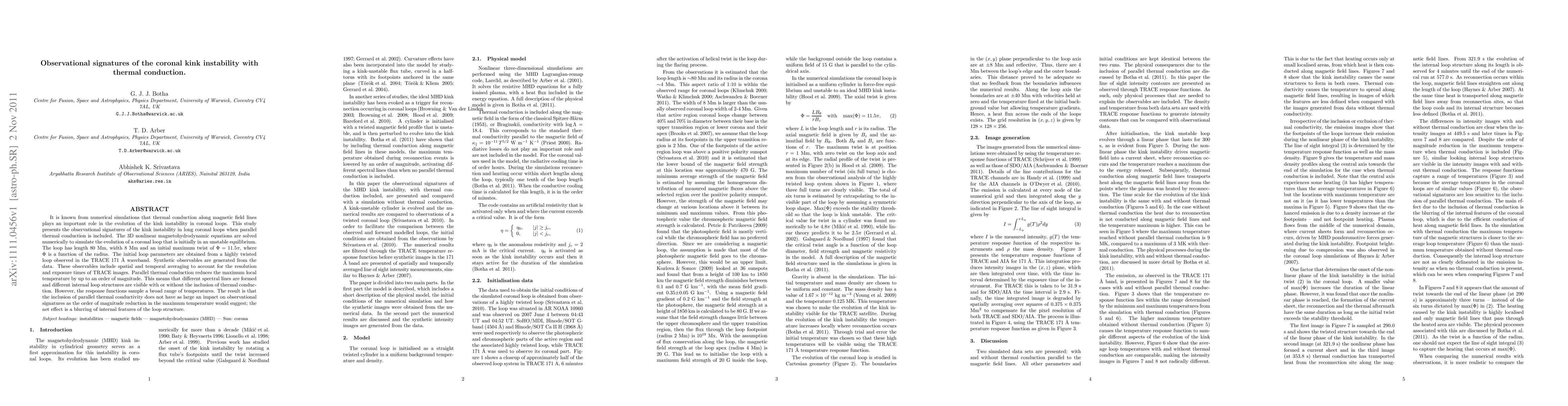 It is known from numerical simulations that thermal conduction along magnetic field lines plays an important role in the evolution of the kink instability in coronal loops. This study presents the observational signatures of the kink instability in long coronal loops when parallel thermal conduction is included. The 3D nonlinear magnetohydrodynamic equations are solved numerically to simulate the evolution of a coronal loop that is initially in an unstable equilibrium. The loop has length 80 Mm, width 8 Mm and an initial maximum twist of Phi = 11.5 pi, where Phi is a function of the radius. The initial loop parameters are obtained from a highly twisted loop observed in the TRACE 171 A waveband. Synthetic observables are generated from the data. These observables include spatial and temporal averaging to account for the resolution and exposure times of TRACE images. Parallel thermal conduction reduces the maximum local temperature by up to an order of magnitude. This means that different spectral lines are formed and different internal loop structures are visible with or without the inclusion of thermal conduction. However, the response functions sample a broad range of temperatures. The result is that the inclusion of parallel thermal conductivity does not have as large an impact on observational signatures as the order of magnitude reduction in the maximum temperature would suggest; the net effect is a blurring of internal features of the loop structure.