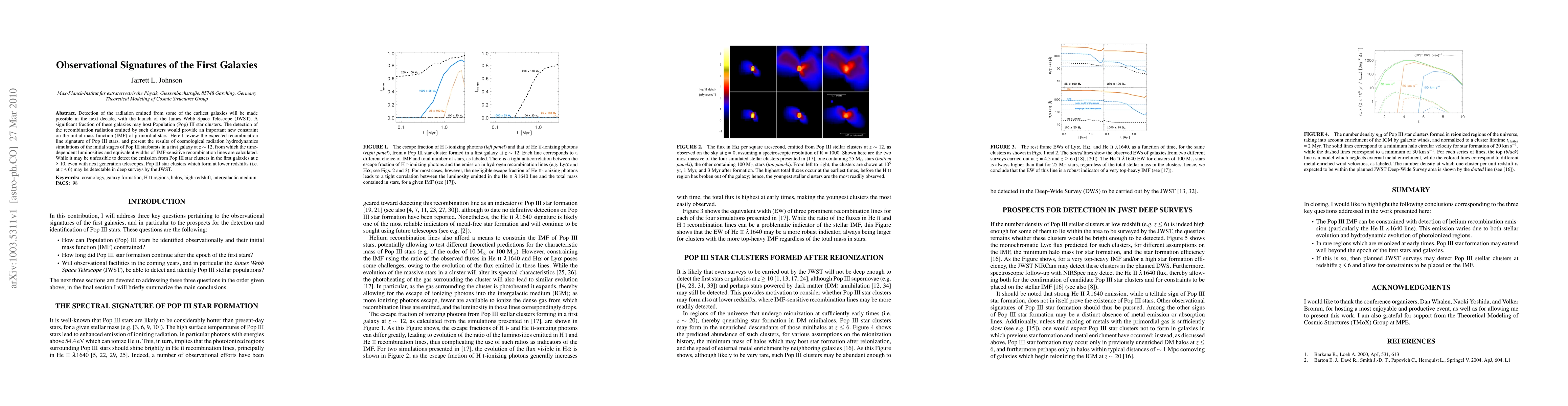 Detection of the radiation emitted from some of the earliest galaxies will be made possible in the next decade, with the launch of the James Webb Space Telescope (JWST). A significant fraction of these galaxies may host Population (Pop) III star clusters. The detection of the recombination radiation emitted by such clusters would provide an important new constraint on the initial mass function (IMF) of primordial stars. Here I review the expected recombination line signature of Pop III stars, and present the results of cosmological radiation hydrodynamics simulations of the initial stages of Pop III starbursts in a first galaxy at z ~ 12, from which the time-dependent luminosities and equivalent widths of IMF-sensitive recombination lines are calculated. While it may be unfeasible to detect the emission from Pop III star clusters in the first galaxies at z > 10, even with next generation telescopes, Pop III star clusters which form at lower redshifts (i.e. at z < 6) may be detectable in deep surveys by the JWST.