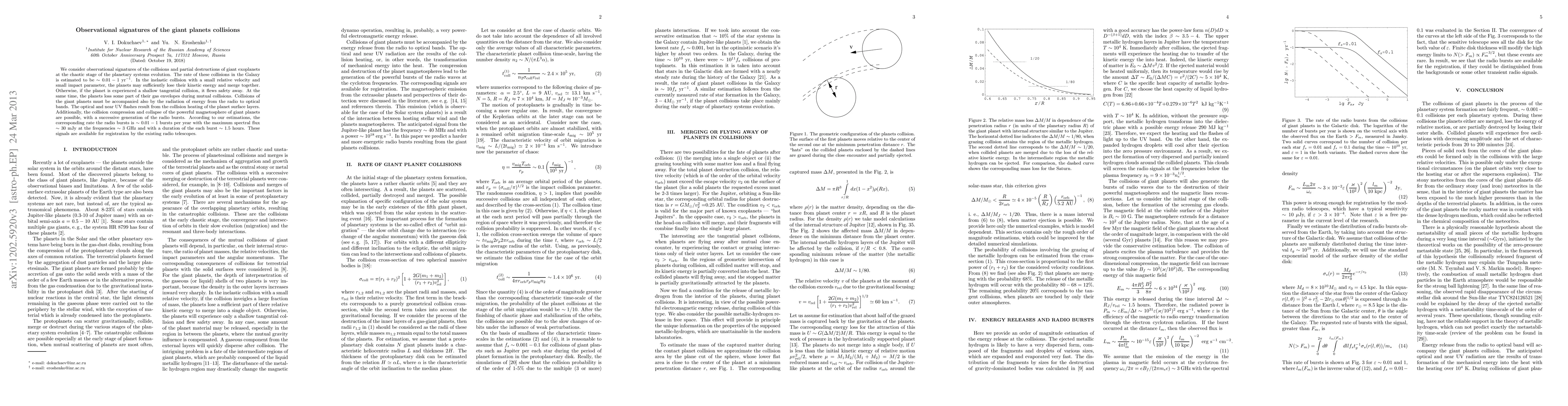 We consider observational signatures of the collisions and partial destructions of giant exoplanets at the chaotic stage of the planetary systems evolution. The rate of these collisions in the Galaxy is estimated to be ~0.01-1 per yr. In the inelastic collision with a small relative velocity and small impact parameter, the planets may sufficiently lose their kinetic energy and merge together. Otherwise, if the planet is experienced a shallow tangential collision, it flews safety away. At the same time, the planets loss some part of their gas envelopes during mutual collisions. Collisions of the giant planets must be accompanied also by the radiation of energy from the radio to optical bands. The optical and near UV flashes result from the collision heating of the planet surface layers. Additionally, the collision compression and collapse of the powerful magnetosphere of giant planets are possible, with a successive generation of the radio bursts. According to our estimations, the corresponding rate the radio bursts is ~0.01-1 bursts per year with the maximum spectral flux ~30mJy at the frequencies ~3GHz and with a duration of the each burst ~1.5 hours. These signals are available for registration by the existing radio telescopes.